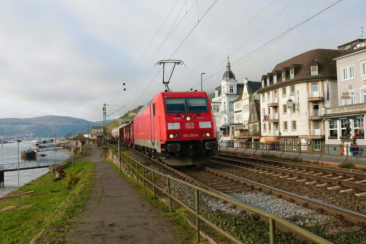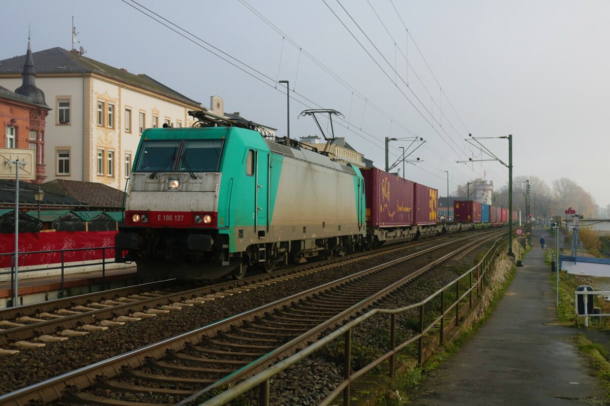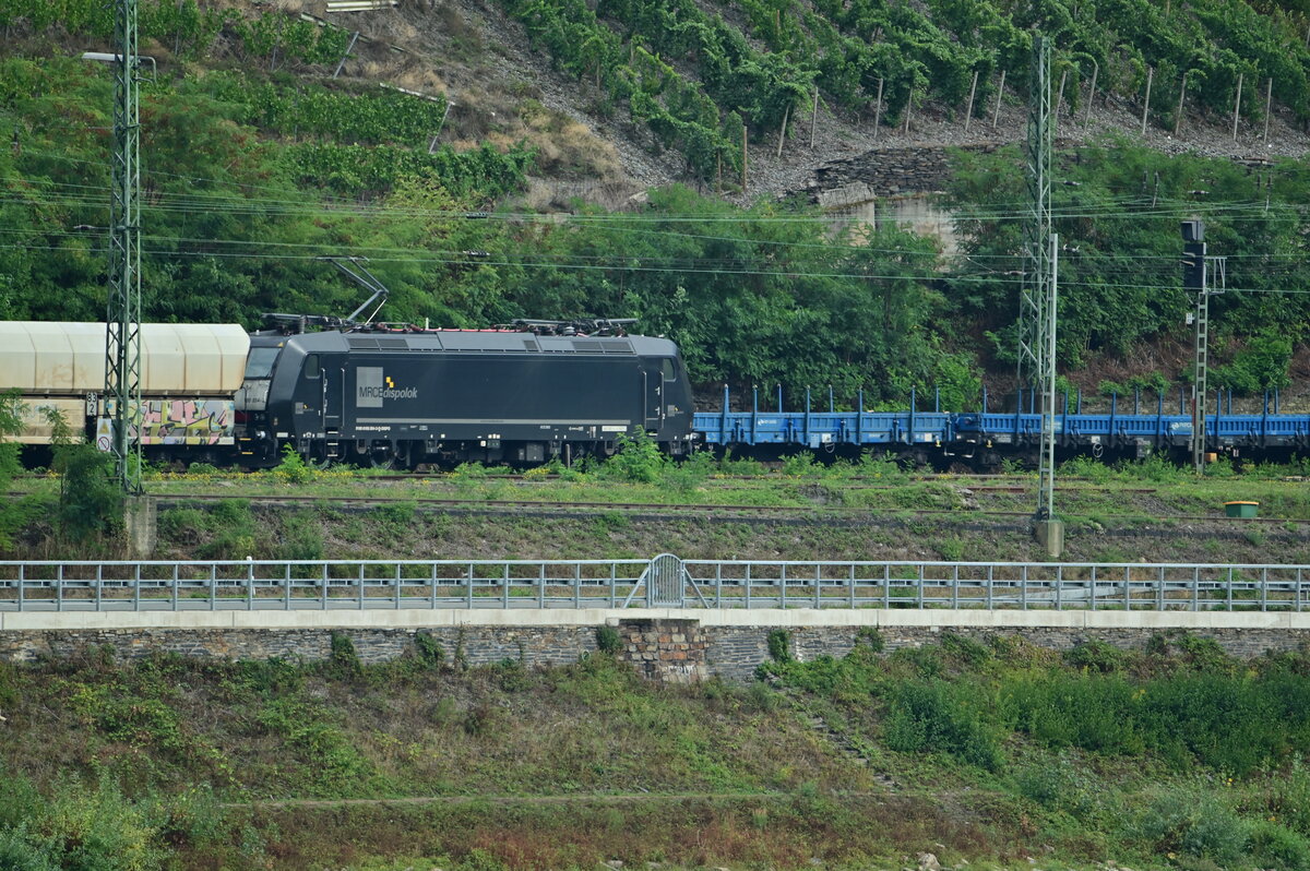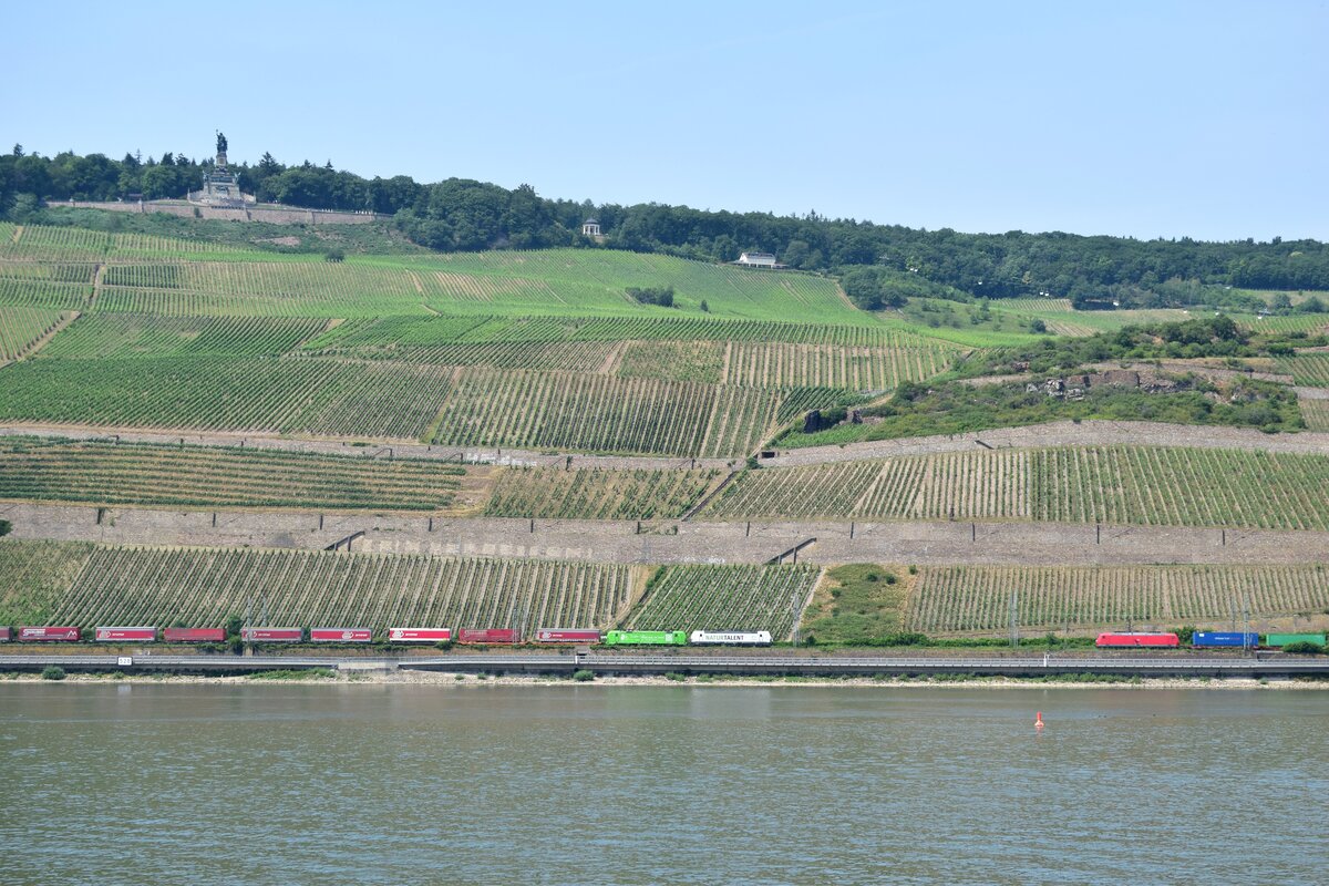 Von Bingen aus konnte ich 193 596 Naturtalent in weiß und 193 281 green deal in grün mit einem KLV auf der rechten Rheinseite kurz vor Rüdesheim aufnehmen.