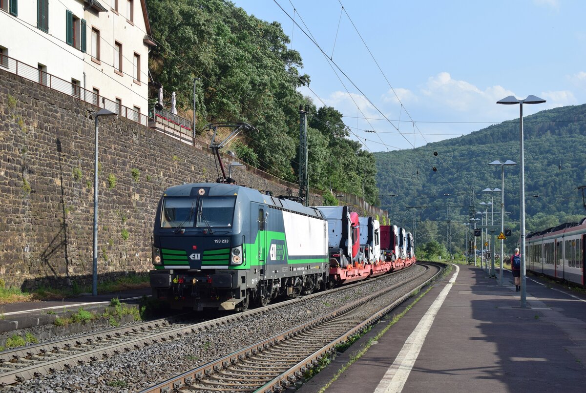 In Assmannshausen kam 193 233 mit neuen Zugmaschinen sowie neuen Aufliegern durch Assmannshausen gen Norden gefahren.