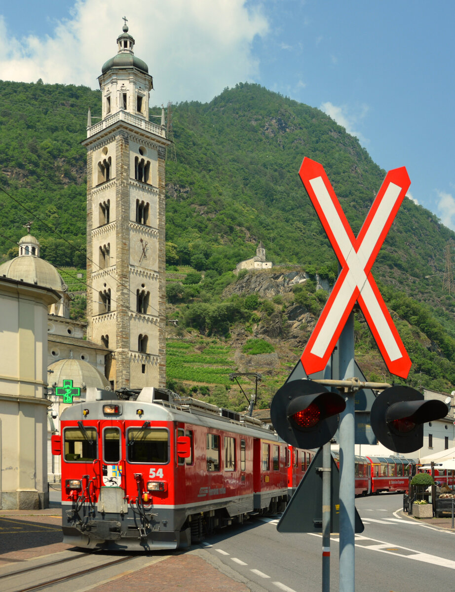 Die Heiligen Kreuze der Berninabahn: Umringt und gesichert, nicht nur, von Andreaskreuzen kommen die ABe 4/4 III 54 und 56 der Rhätischen Bahn (RhB) mit einem "Bernina-Express" am 15. Juni 2022 langsam als "Straßenbahn" über den Piazza Basilica im italienischen Tirano gerollt und erreichen in Kürze den dortigen Bahnhof. Im Hintergrund sind die Basilika Madonna di Tirano und auf dem Felsen am Berg die Chiesa di Santa Perpetua zu erkennen. Matthias Kümmel
