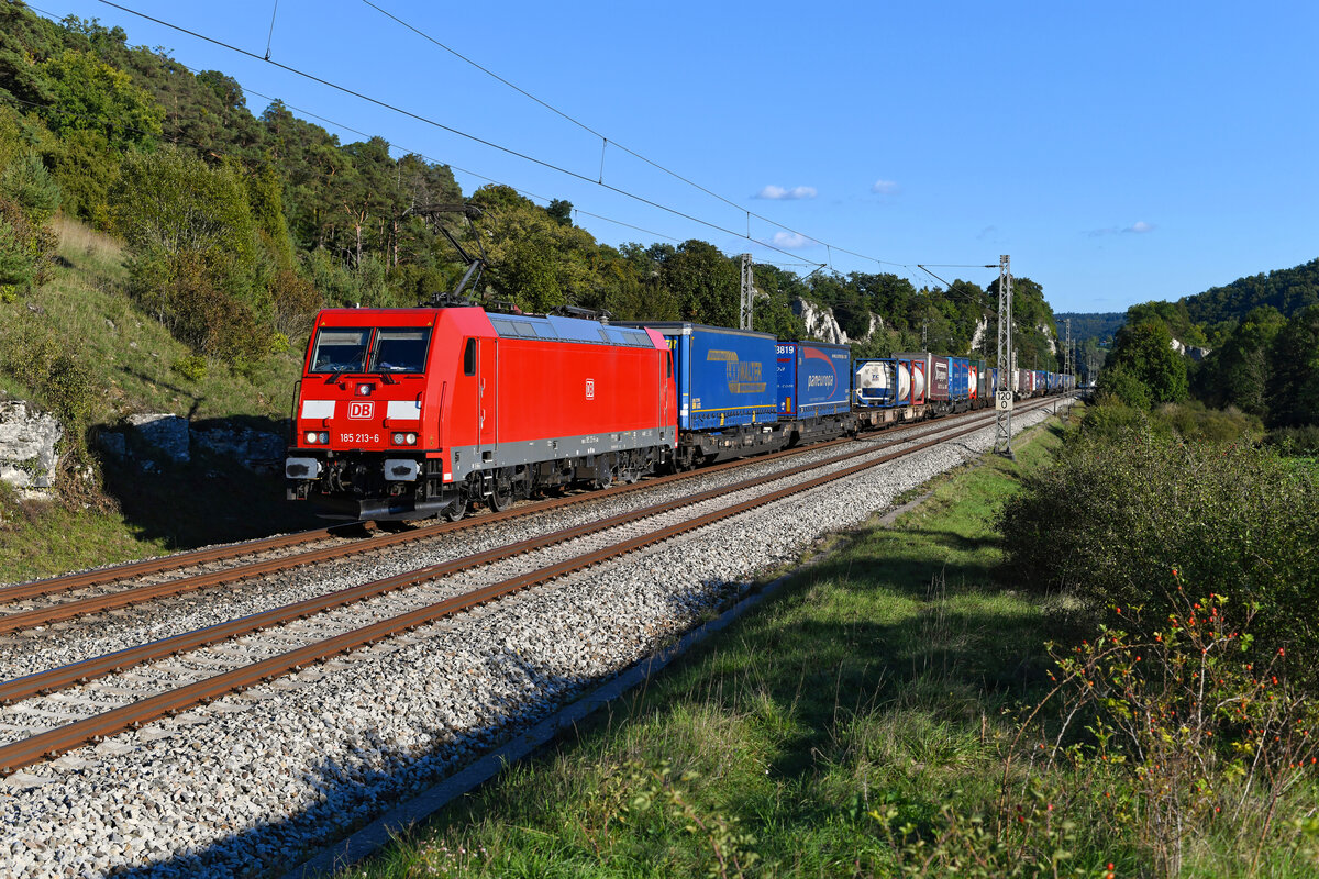 In ungewöhnlich gutem Pflegezustand präsentierte sich am 22. September 2022 die 185 213, als ich sie vor einem westwärts fahrenden KLV-Zug bei Hagenacker im Altmühltal fotografieren konnte. Christoph Schneider