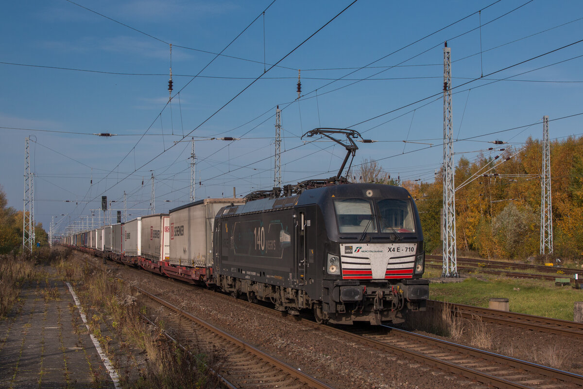 MRCE/Mercitalia 193 710-1 mit einem KLV-Zug von Rostock-Seehafen in Richtung Berlin. Fotografiert am 30.10.2022 am ehemaligen Haltepunkt Dierkow. Christian Geschonneck