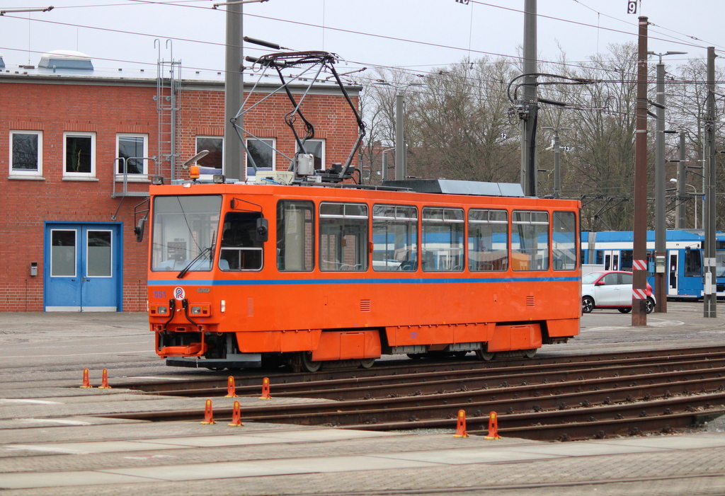 Der Tatra Wagen T6A2(551)aus dem Baujahr1990 von CKD Praha-Smichov stand am 09.01.2022 ganz alleine auf dem Betriebshof der Rostocker Straßenbahn AG Stefan Pavel