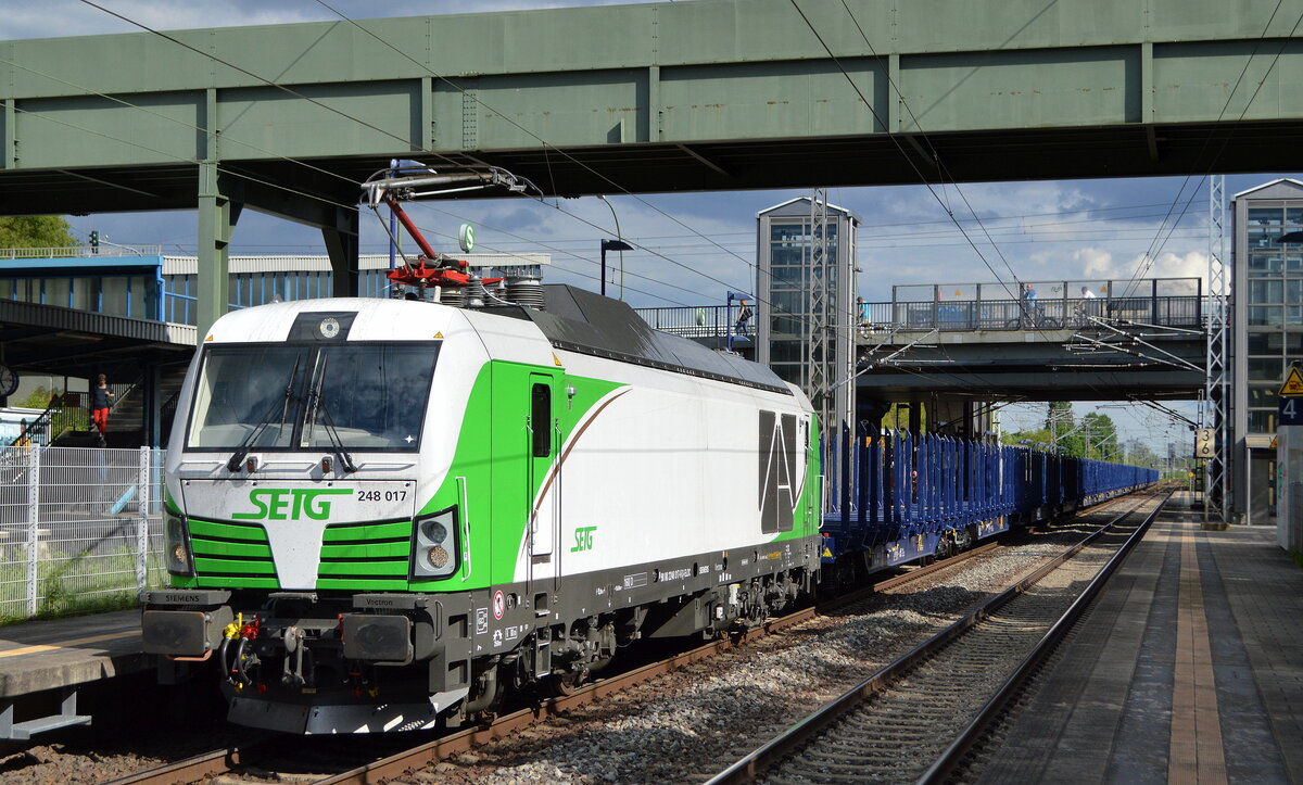 Salzburger Eisenbahn TransportLogistik GmbH, Salzburg [A] mit "248 017" [NVR-Nummer: 90 80 2248 017-6 D-ELOC] und einem leeren Ganzzug für Stammholz-Transporte Richtung Rostock am 07.06.22 Durchfahrt Bf. Berlin Hohenschönhausen. Lothar Stöckmann
