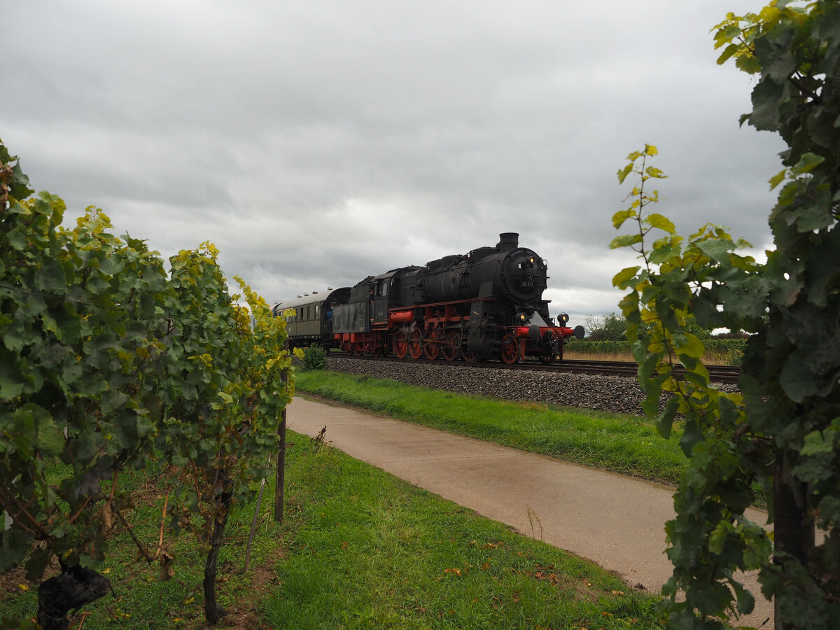 58 311 der Ulmer Eisenbahnfreunde zieht einen Dampfzug von Landau nach Neustadt/W., aufgenommen vor dem Bahnhof Edesheim.