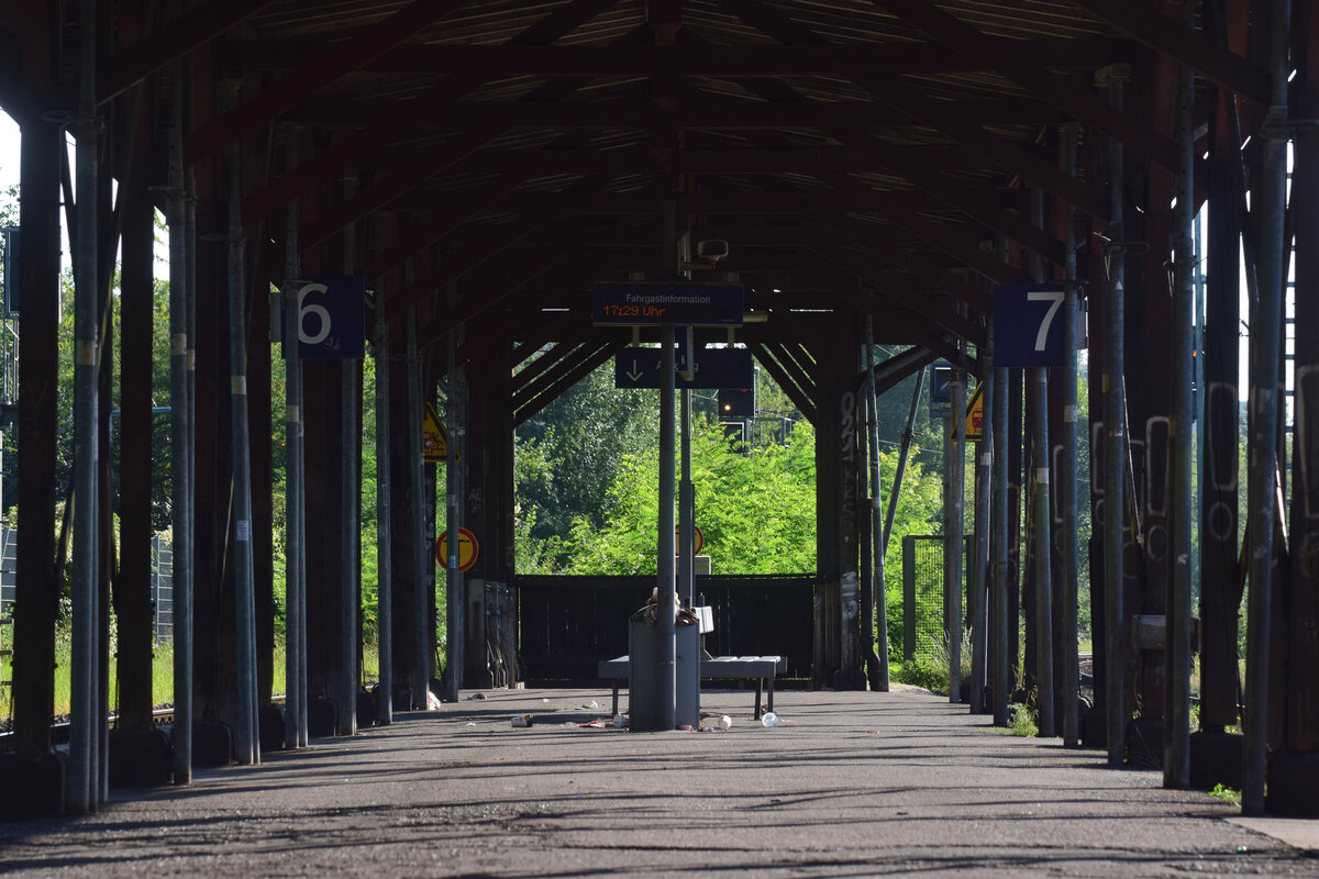 Blick auf den alten Bahnsteig sowie das Bahnsteigdach aus dem Jahre 1912 in Odenkirchen. Ursprünglich sollte der Bahnhof schon seit vielen Jahren saniert worden sein, durch den Denkmalschutz durfte das Dach bislang nicht abgerissen werden. Die Instandhaltung wurde sehr vernachlässigt und zum Schluss wurde das Dach mit extra Stützen verstärkt. Ende 2023 wurde das Dach abgebaut und im Jahr darauf der Bahnsteig grundlegend modernisiert.