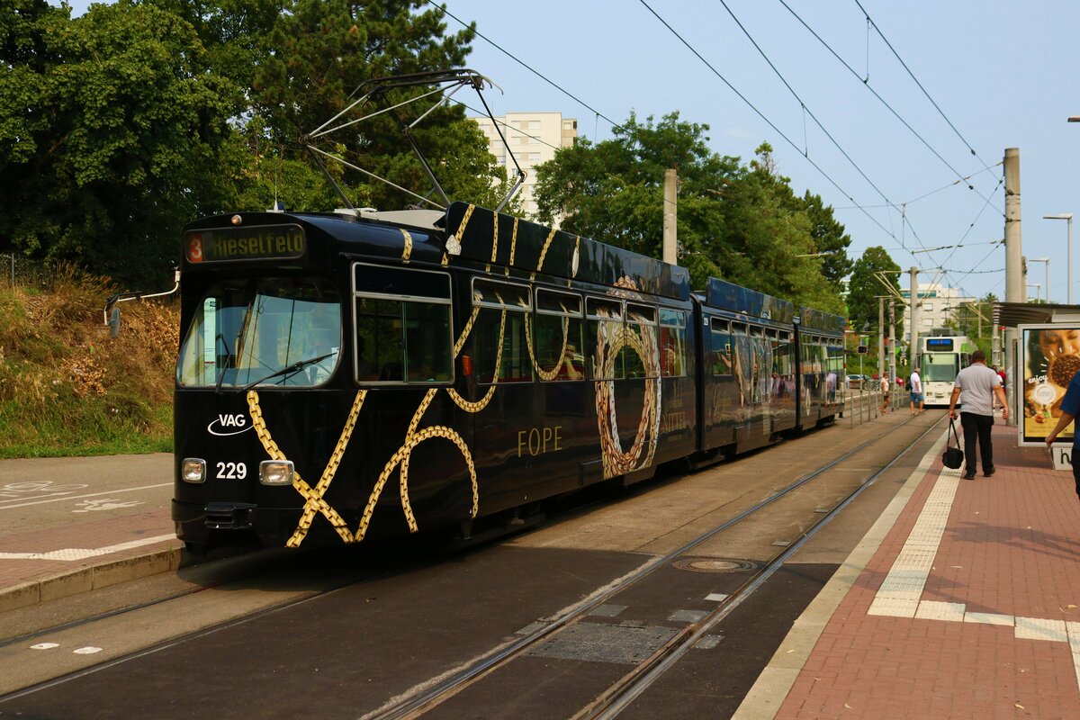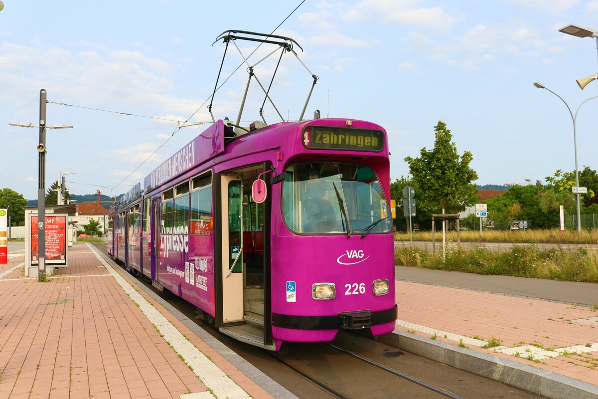 GT8N 226 der VAG rollt am 29.09.2023 durch den Freiburger Stadtteil Vauban. Der Triebwagen gehört zur letzten Serie der GT8 und verfügt über einen Niederflurmittelteil. Christopher Pätz