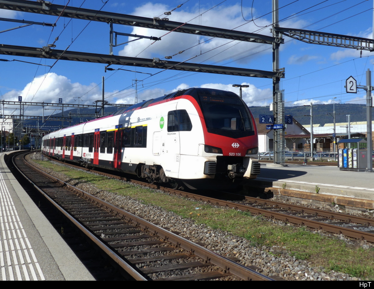 SBB - Regio von Lausanne nach Kerzers bei der einfahrt der RABe 523 110 im Bhf. Kerzers am 14.01.2023.. Standort des Fotografen auf dem Perron Hp. Teutschmann