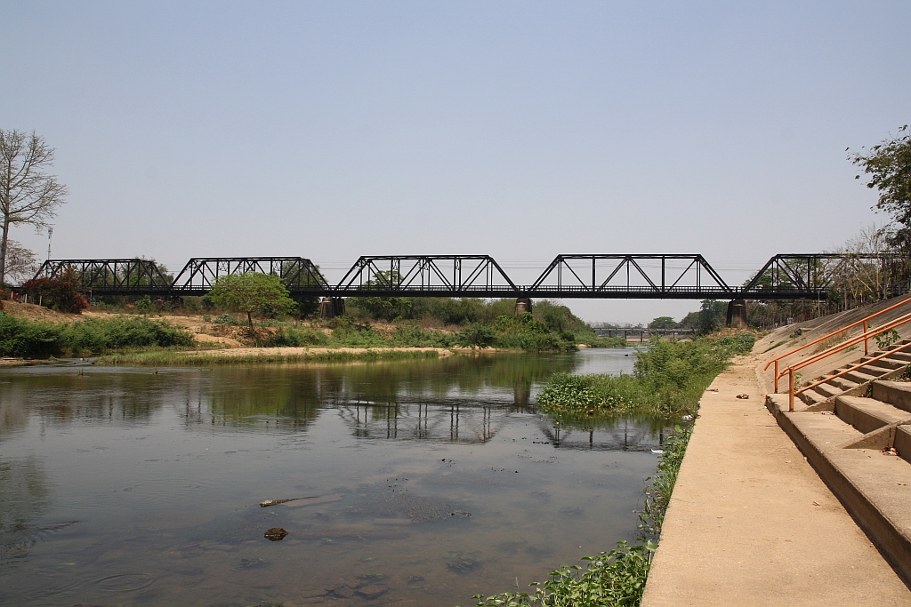 Nur 1 Kilometer von der Nakhon Lampang Station in Richtung Norden entfernt befindet sich eine 296,68m lange Stahlbrücke über den Mae Nam (=Fluss) Wang. Von den 9 Brückenfeldern sind 5 als trapezförmige Fachwerkbrücke ausgeführt. - Nach den Standards der SRT mit 6 Farbschichten (3 x Braun, gefolgt von Weiß, Grau und die äußersten Schicht Schwarz) gegen Korrosion geschützt ist die letzte Farbschicht der Ursprung des Spitznamens "Saphan Dam" (=Schwarze Brücke). - Am 20. Dezember 1916 eröffnet, wurde die Brücke am 3.Jänner 1944 von Flugzeugen bombardiert und minimal beschädigt. Noch heute sind Spuren von Granatsplittern und Schussspuren erkennbar. - Von 1964 bis 1966 erfolgte durch die japanische Takigami Steel Construction Co., Ltd. die Sanierung der Kriegsschäden. Bild vom 24.März 2023. Karl Seltenhammer