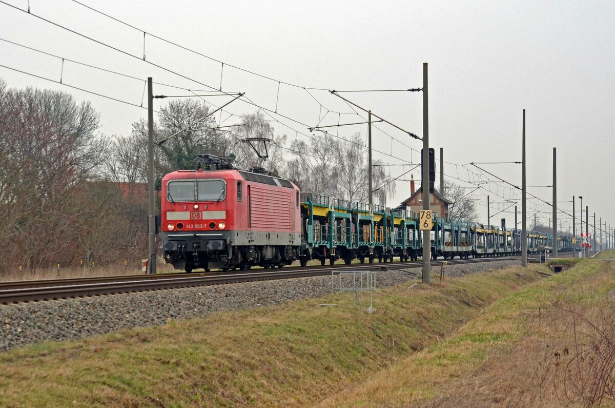 Netzwerkbahn Sachsen mit der DB Mietpool Lok "143 012", Name: "Marie-Luise" (NVR: "91 80 6143 012-3 D-DB") und einem PKW-Transportzug am 27.09.23 Durchfahrt Bahnhof Rodleben. Lothar Stöckmann