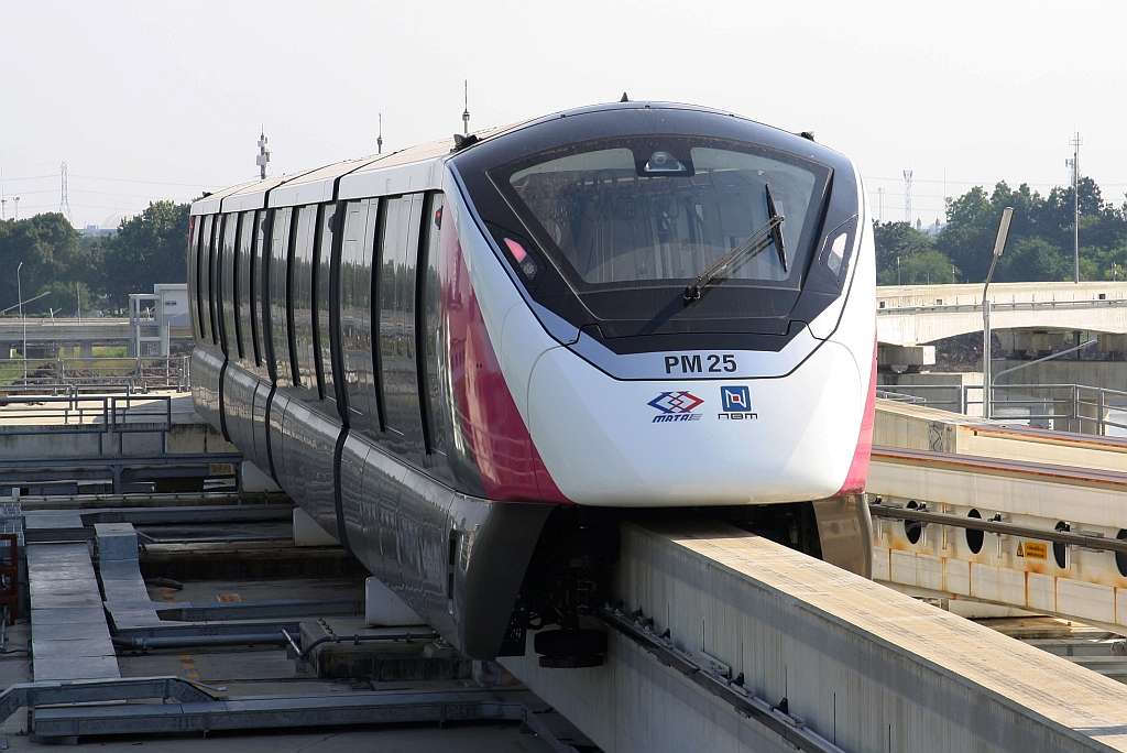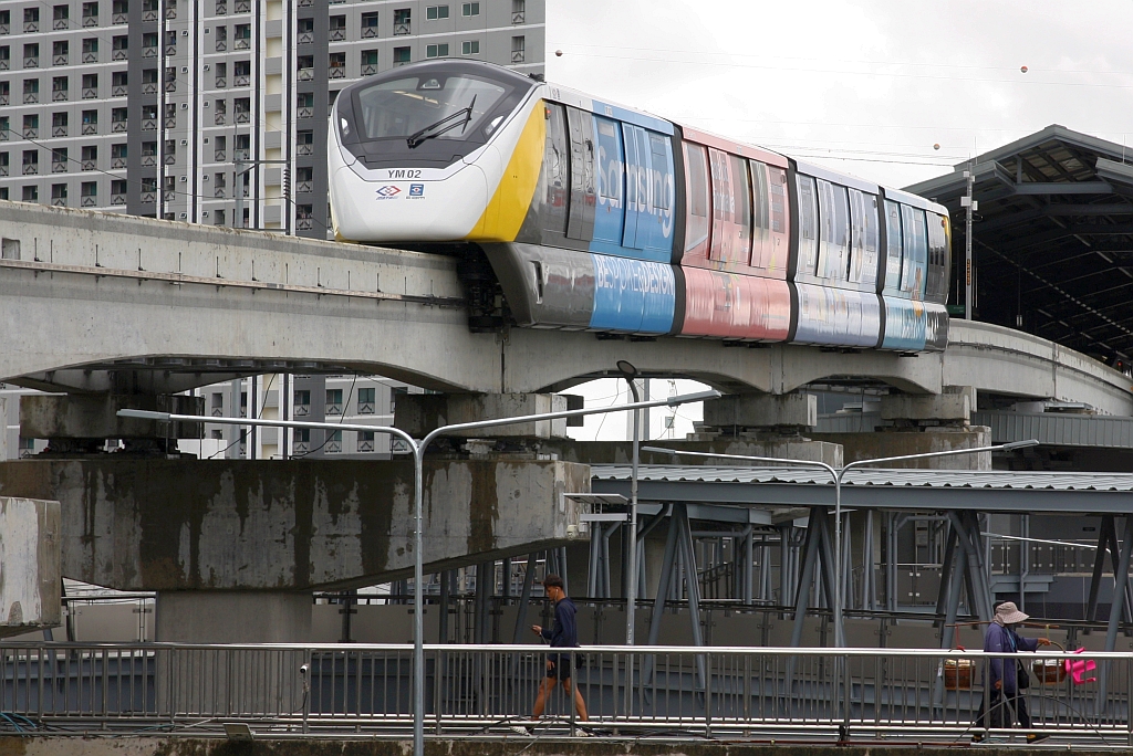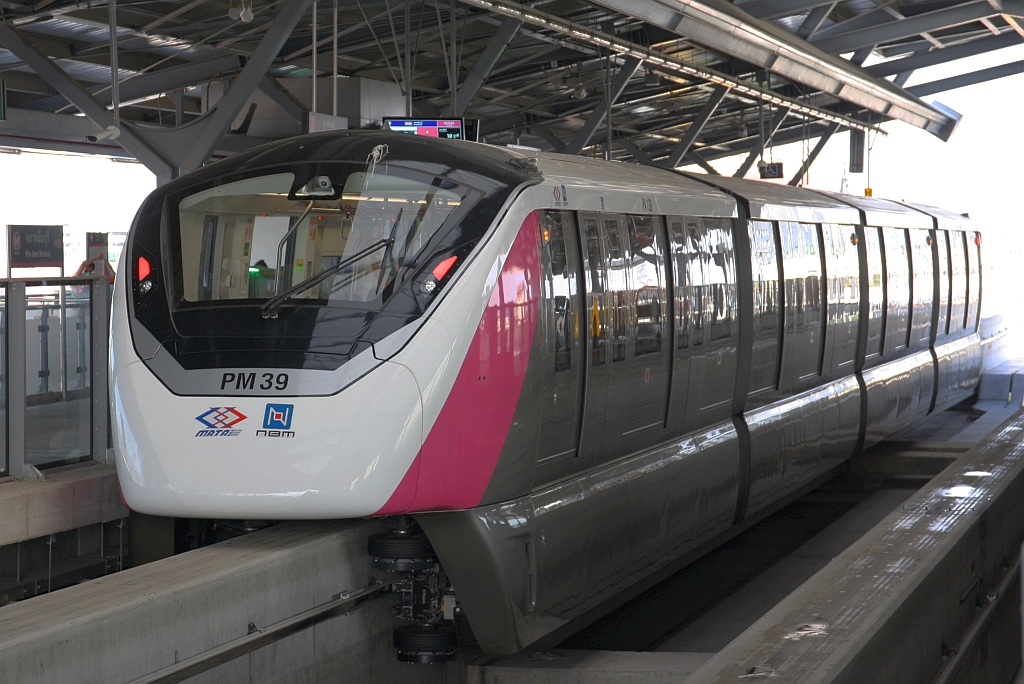 MRT YM04 begegnet am 28.September 2023 dem MRT YM07 (beide Hersteller: Bombardier Transportation + CRRC Nanjing Puzhen, Type Innovia Monorail 300) zwischen der Sri Kritha Station (YL10) und der Hua Mak Station (YL11). Karl Seltenhammer