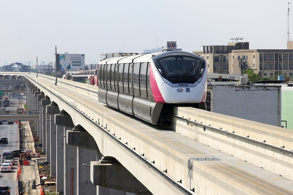 MRT PM39 (Hersteller: Bombardier Transportation + CRRC Nanjing Puzhen, Type Innovia Monorail 300) nähert sich am 11.Dezember 2023 von der Setthabutbamphen Station (PK28) kommend der Min Buri Market Station (PK29). Karl Seltenhammer
