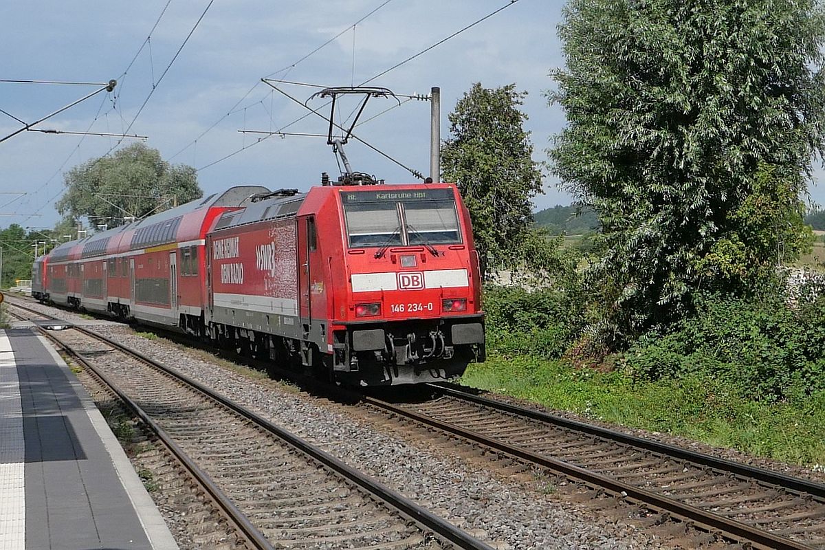 Statt Steuerwagen eine zweite Lok (|) - Ist für einen Wendezugbetrieb kein Steuerwagen verfügbar, wird eine zweite Lok benötigt. 146 235-7 mit den Wagen des RE 2 / 4722 von Konstanz nach Karlsruhe und 146 234-0 am Zugende durchfahren am 12.08.2023 die Station Hegne. Jürgen Vos