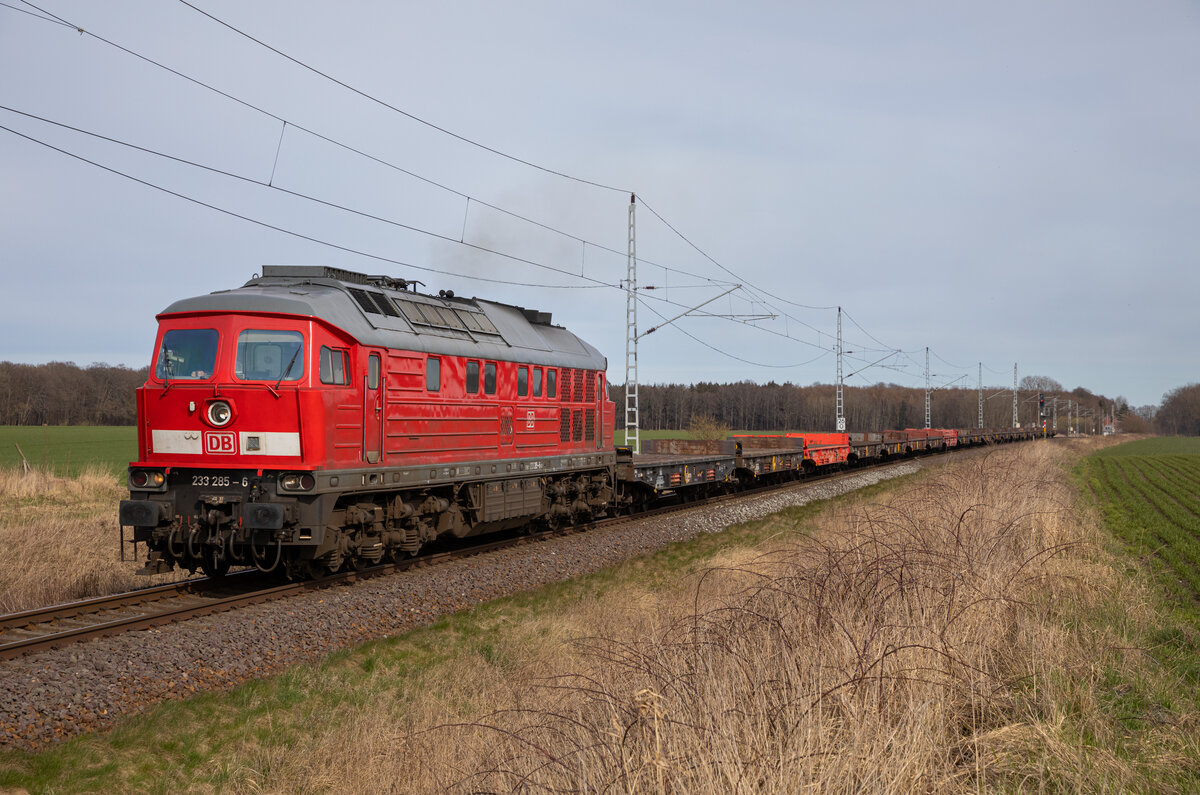 DB Cargo-233 232-8 am 24.2.2023 auf dem Rückweg von Saalfeld/Saale nach Halle. Nun hatte sie die beiden Gravitas 261 046-7 und 261 024-4 am Haken. Hier zu sehen zwischen Pößneck und Oppurg. Dank großzügiger Vegetationsarbeiten in letzter Zeit an der Strecke wurde dieses Motiv ermöglicht. Markus Klausnitzer