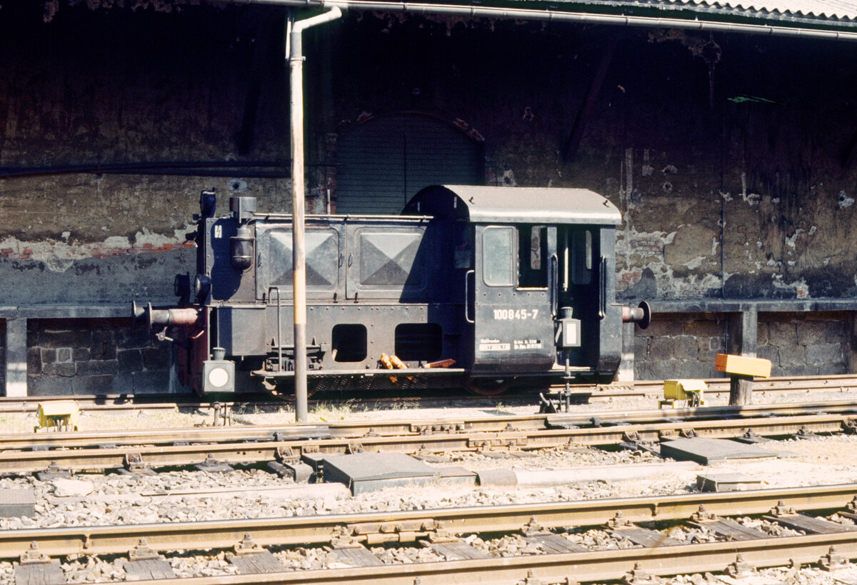 Lokschuppenaufnahmen sind wegen der Enge für einen Fotografen immer problematisch, so auch bei der 100 875 am 19.09.1991 im Bw. Leipzig-Wahren. Das Tfz. wurde 1943 als Kbf. 5075 an die DRB geliefert, gelangte dann an die DR, wurde 1970 in 100 875 und 1992 nochmals in 310 875 umgezeichnet.