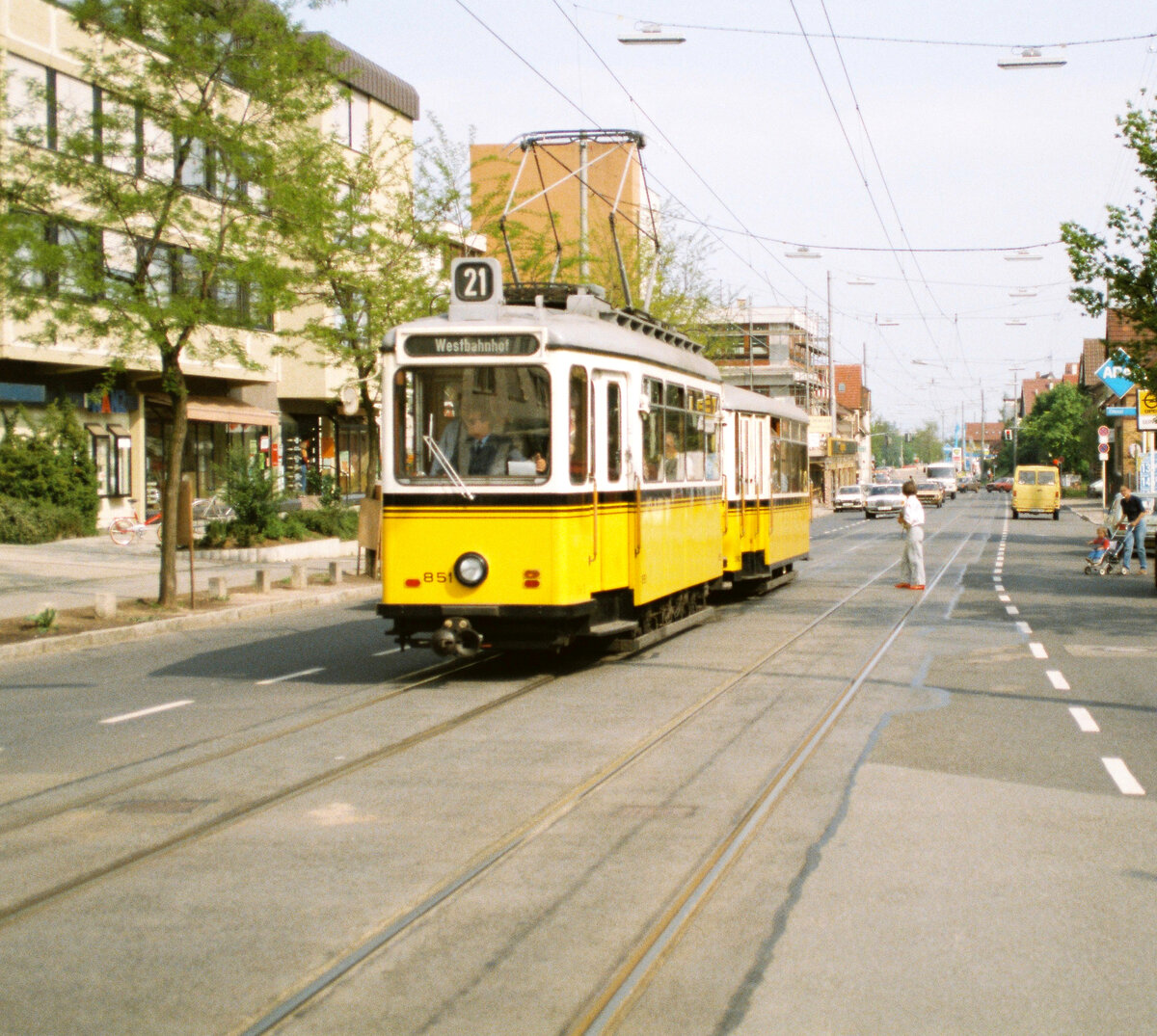 Sehr gefährlich war für die Straßenbahn die Überquerung der Straße nach der Gerlinger Endstation (es gab keine Ampel!), auch so bei dieser Sonderfahrt mit TW 851 und Beiwagen 1390 (26.09.1986) Frank Nowotny