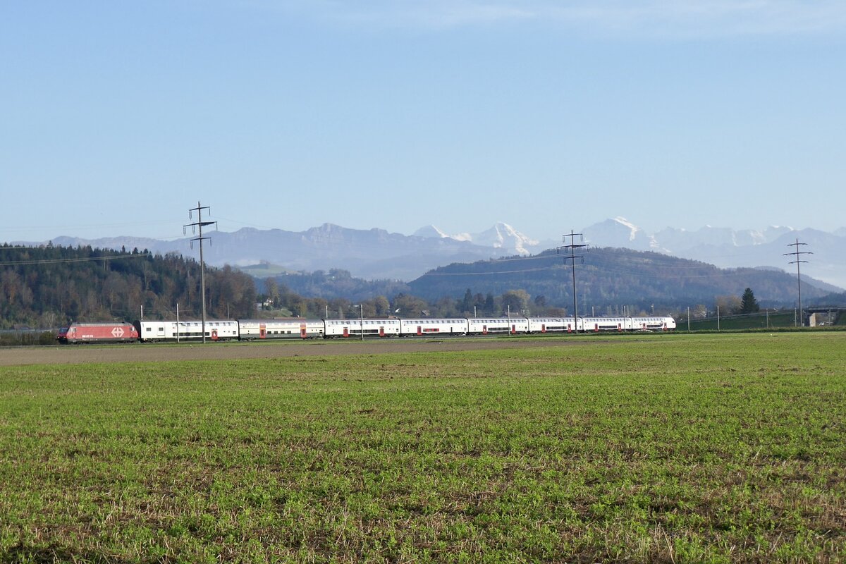 Eine Re 460 mit IC 2000 Pendel unterwegs Richtung Bern am 11.11.24 bei Wichtrach.
