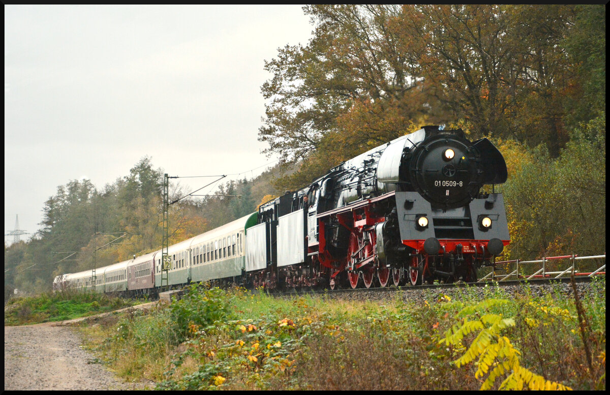 Der exPRESSzugreisen-Sonderzug DPE 1820/1821 Dresden - Wernigerode u. z. wurde am 31.10.2024 mit drei verschiedenen Lokomotiven befördert. Von Dresden bis Zwickau/Sachsen war Lok Nr. 1 die Elektrolok PRESS 145 030-7 eingeteilt. In der westsächsischen Industriestadt erfolgte der Lok- und Traktionswechsel von Elektro- auf Dampf- und Dieseltraktion. Die Loks Nr. 2 Dampflok PRESS 01 0509-8 mit Zusatztender und Nr. 3 Diesellok PRESS 118 757-4 beförderten den Sonderzug bis ans Ziel am nördlichen Harzrand und konnten kurz vor Gößnitz/Thüringen fotografiert werden. Die Diesellok am Zugschluss war notwendig, um den gesamten Zug für die Rückfahrt in Halberstadt über das Gleisdreieck zu drehen. Das Fehlen einer funktionsfähigen Drehscheibe in Wernigerode und Umgebung erforderte diesen Aufwand.