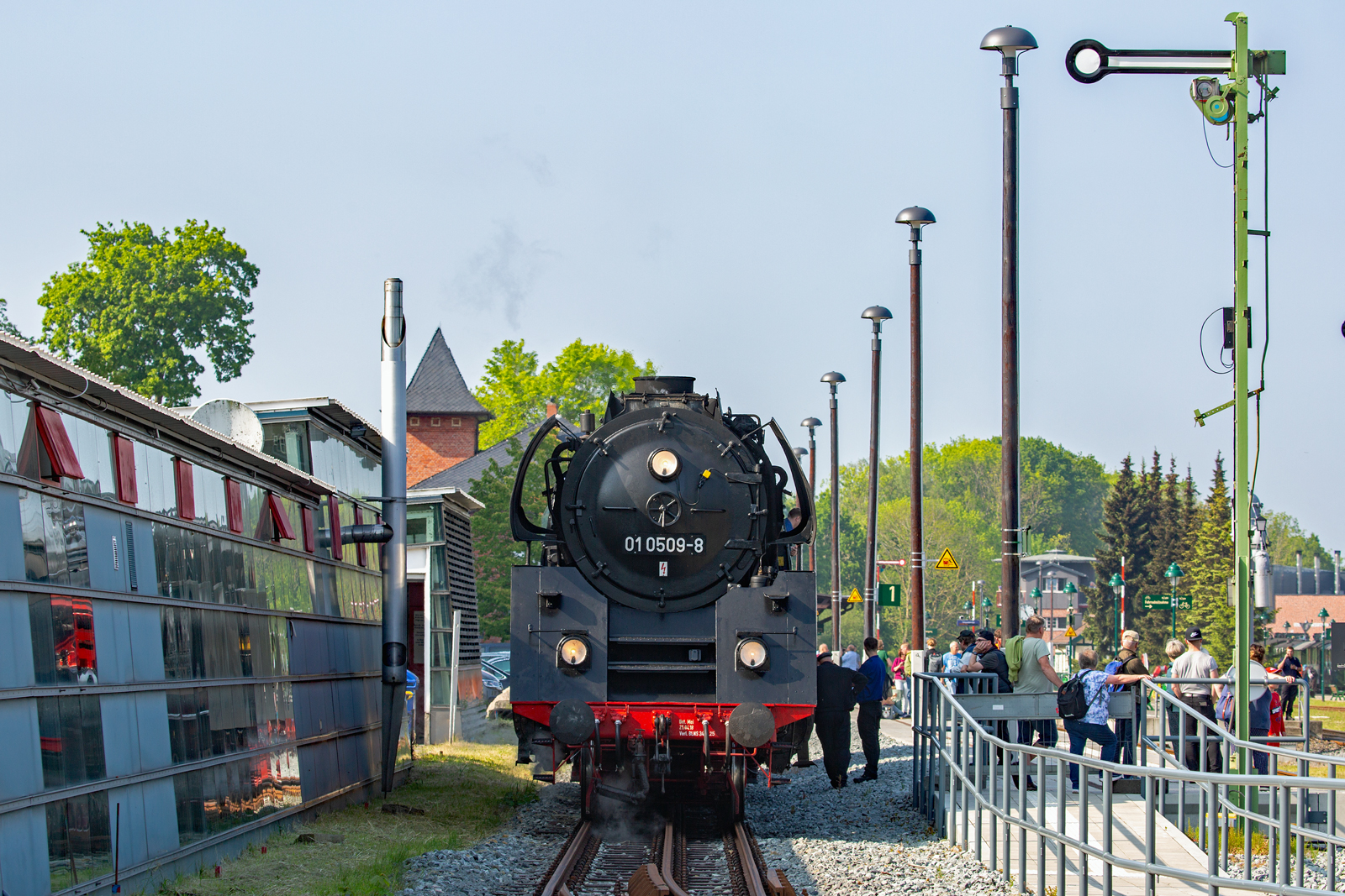 Die Neue Betriebswerkstatt in Putbus gesehen von der Aussichtsplattform des neu errichteten Wasserturms. Der ausfahrende Sonderzug mit der Dampflok 01 0509 in Richtung Bergen kündigt das nahe Ende des ersten Festtages an. - 25.05.2024 - Zum Bahnhofsfest in Putbus öffentlich zugänglich.