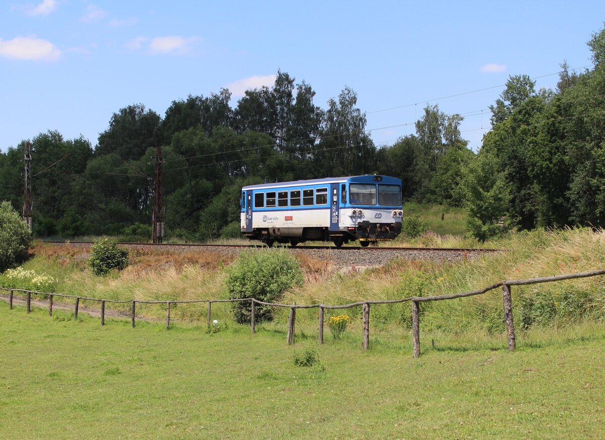 Brotbüchse 810590-0 steht hier am 7.6.2024 um 14.53 Uhr abfahrbereit im Bahnhof Blatno u Jesenice nach Bezov nad Teplou. Dahinter rangiert die GKW Praha 740508-7 einen Bauzug. Gerd Hahn