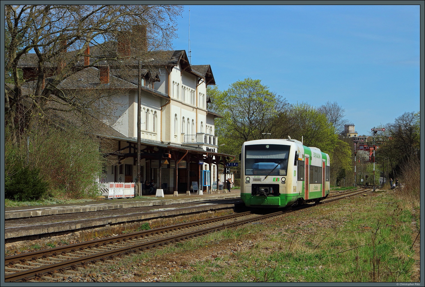 VT 315 der Erfurter Bahn erreicht am 06.04.2024 den Bahnhof Niederpöllnitz, der sich mit Grasbahnsteigen und Pilzleuchten noch sehr ursprünglich präsentiert. Christopher Pätz