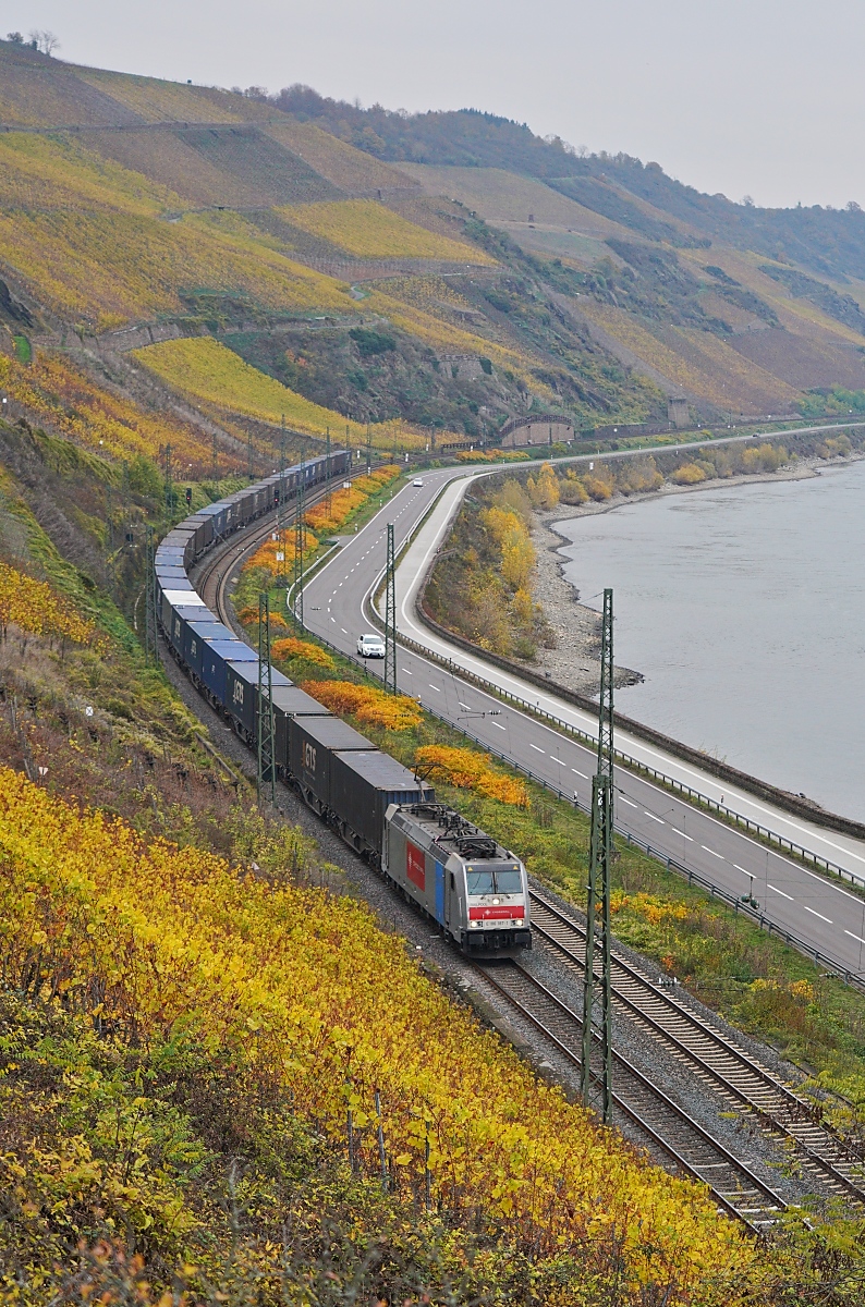 Mit einer 152 im Schlepp befördert 185 264-9 am 16.11.2024 einen Güterzug an den Weinbergen des Bopparder Hamms entlang in Richtung Koblenz Horst Lüdicke