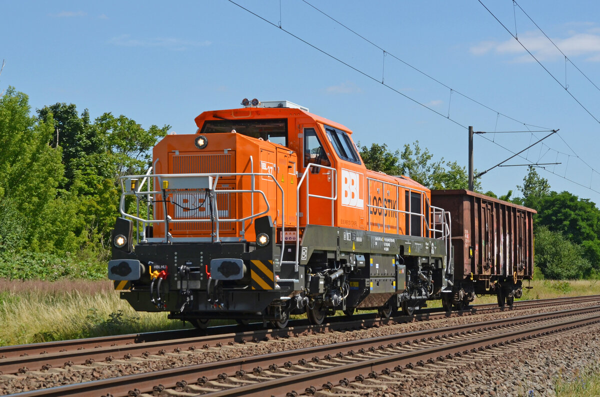 BBL Logistik GmbH, Lüneburg mit ihrer Lok "BBL 01" (NVR: "92 80 1214 002-8 D-BBL") und einem halb vollen Schotterzug am 27.05.24 Höhe Bahnhof Hamburg-Harburg. Lothar Stöckmann