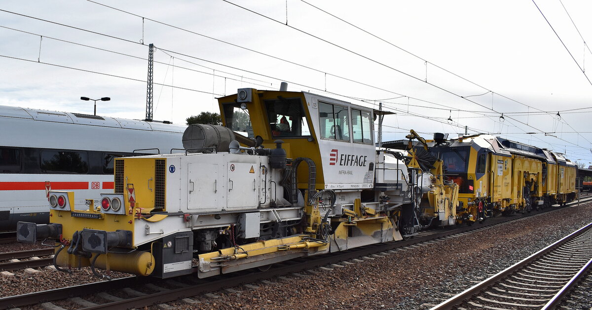 Deutsche Plasser Schnell-Schotterplaniermaschine SSP 110 SW der Fa. Eiffage Rail Deutschland GmbH mit der Nr.: "99 80 9425 039-1 D-ERD" am Haken von der P&T Gleistopfmaschine vom Typ Unimat 09-4x4/4S Dynamic E³ am 09.10.24 Höhe Bahnhof Schönefeld b. Berlin. Lothar Stöckmann