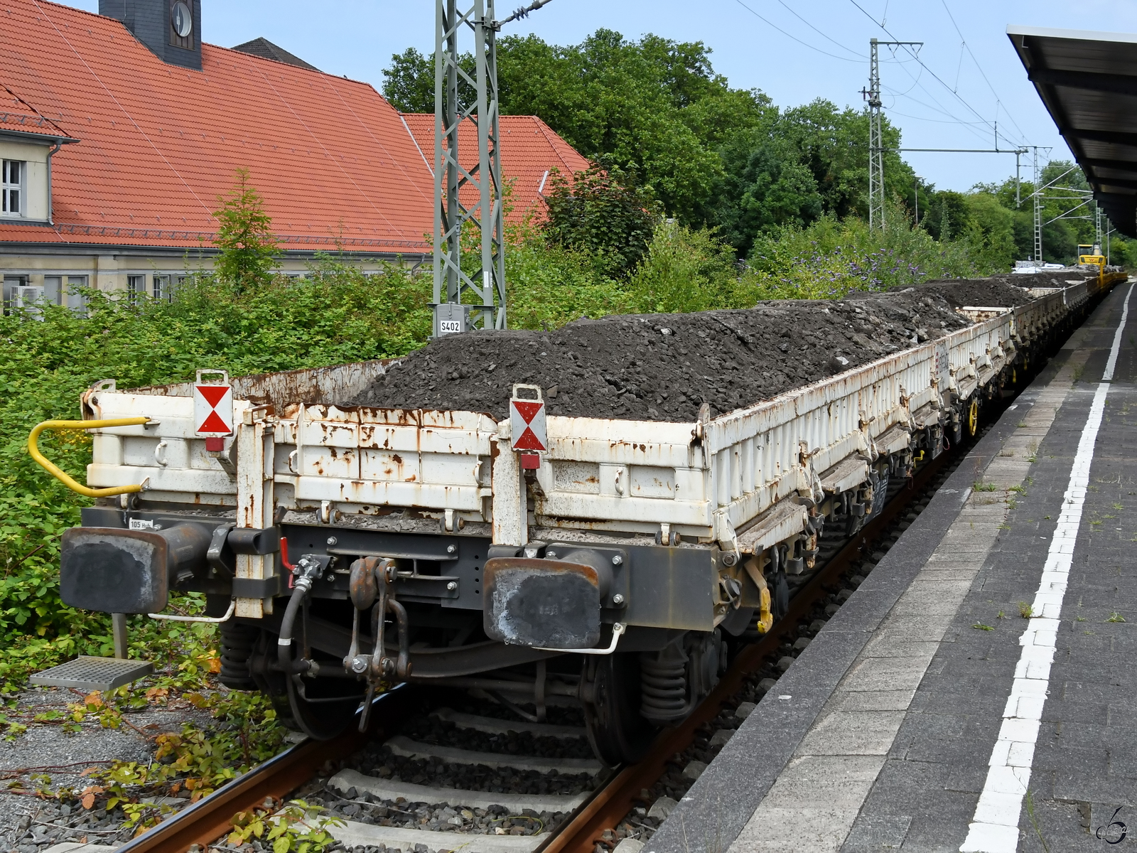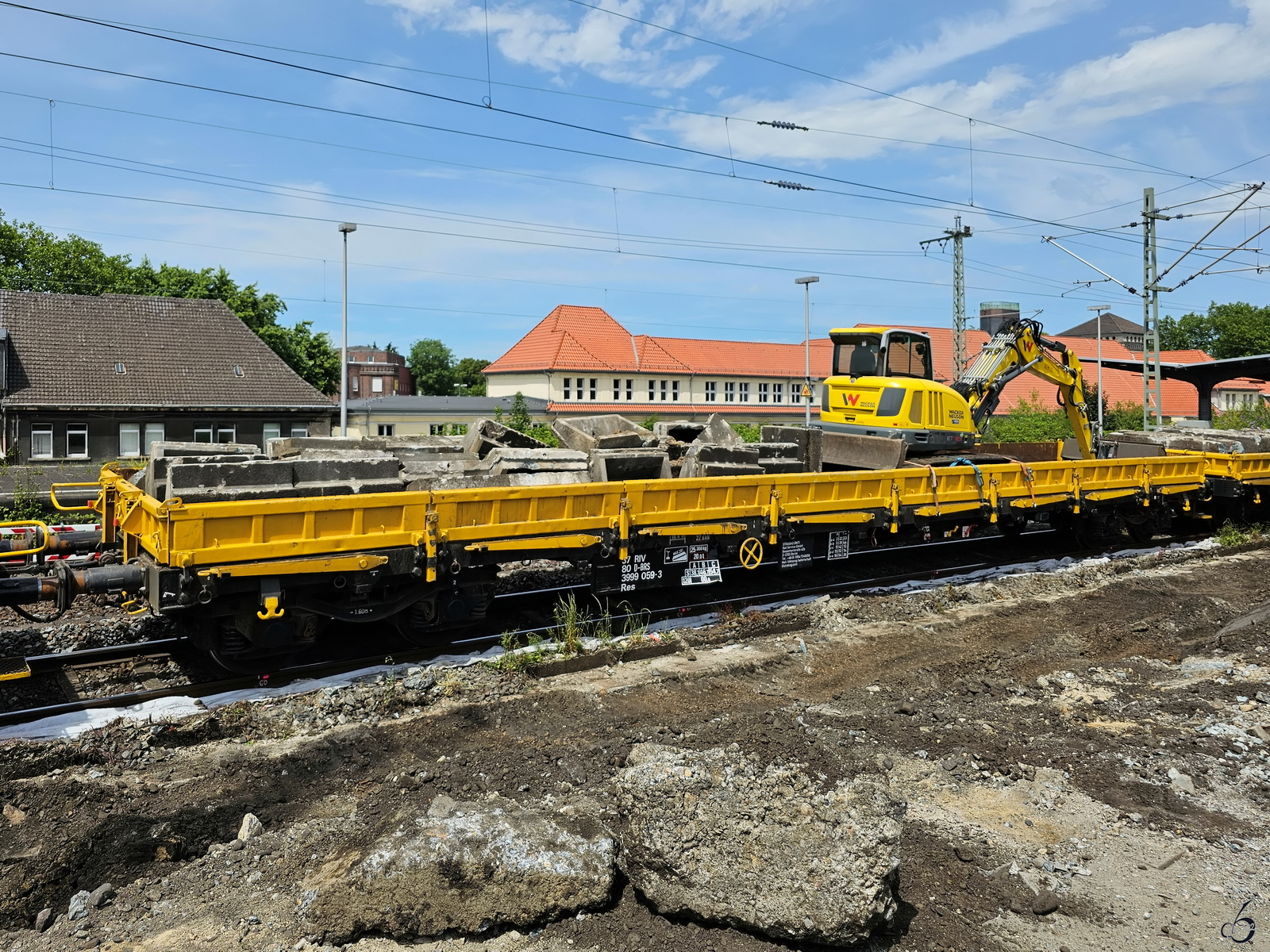 Ende Juni 2024 war am Hauptbahnhof in Wanne-Eickel dieser mit Abbruchmaterial und einem Bagger beladene Flachwagen (Res, 37 80 3999 059-3) zu sehen. Christian Bremer