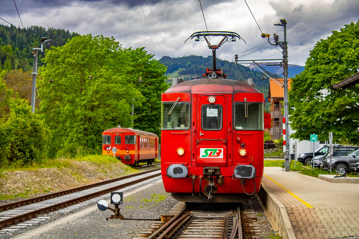 Übelbach. Viel altes Eisen im Bahnhof Übelbach: Am 07.05.2024 treffen die beiden ehemaligen SZU-Wagen aufeinander, rechts macht sich gerade der ET 15 abfahrbereit als S11 nach Peggau. Armin Ademovic