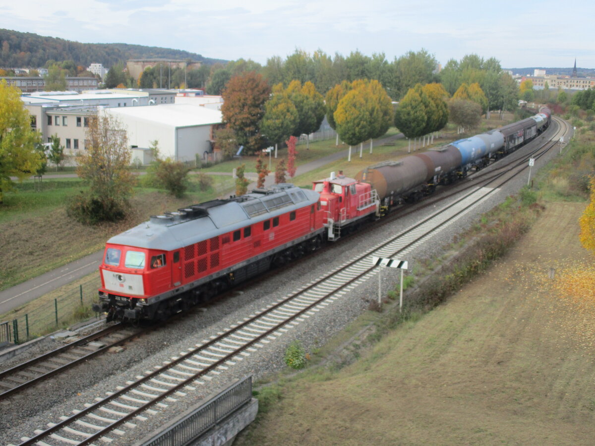 Wegen Bauarbeiten in Zeitz und Pegau mussten im Oktober 2025 Güterzüge umgeleitet werden. Am 20.10.2025 war daher 232 908-4 in Gera-Debschwitz in Richtung Altenburg zu sehen, wobei eine Zeitzer Rangierlok mitgeschleppt wurde. Heiko Baumann