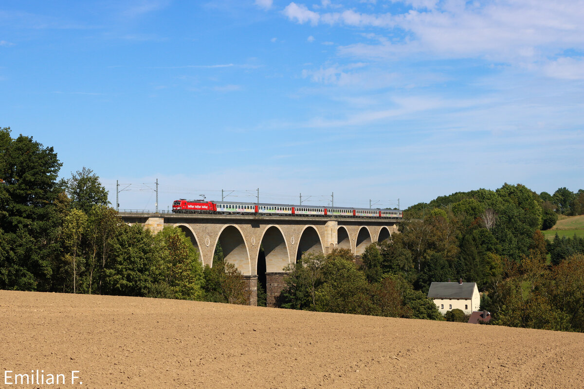 Für das Kulturhauptstadtjahr 2025 in Chemnitz gab es 3 Verbindungen direkt von Stockholm/Malmö bis Chemnitz durch über Hamburg, Berlin und Dresden. Am 20.09.25 ist der letzte der 3 Züge Richtung Chemnitz gefahren, welcher auf dem Wegefarthener Viadukt festgehalten werden konnte. Dank der Verspätung von ca. 50 Minuten stand die Sonne besser und der Schlonz ist weg gezogen. Glück gehabt! Emilian F.