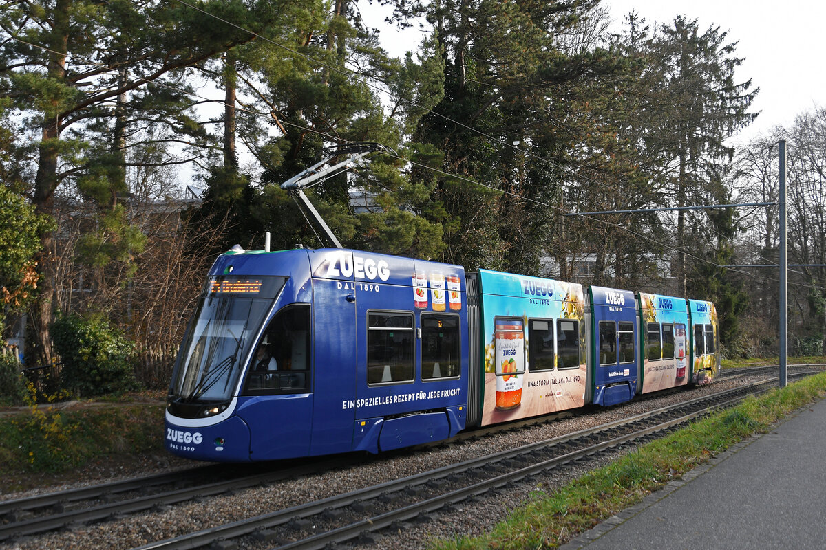 Be 4/6 Flexity 6011 mit der Werbung für die Konfitüre von Zuegg, auf der Linie 15, fährt am 22.12.2025 zur Haltestelle Lerchenstrasse. Aufnahme Basel. Markus Wagner