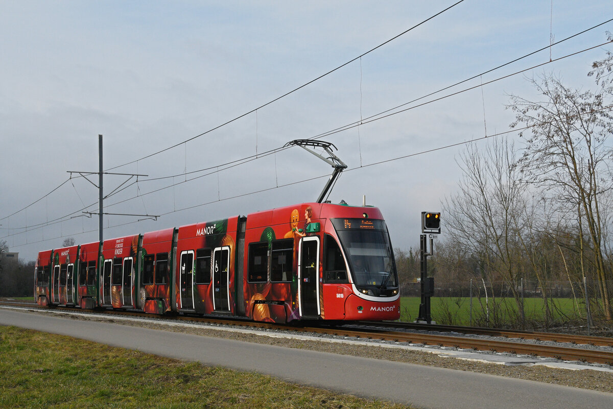 Be 6/8 Flexity 5030 mit einer Eigenwerbung für nachhaltigen und Klimaneutralen Öffentlichen Verkehr, auf der Linie 3, fährt am 05.11.2025 zur Haltestelle Burgfelden Grenze. Aufnahme Basel. Markus Wagner