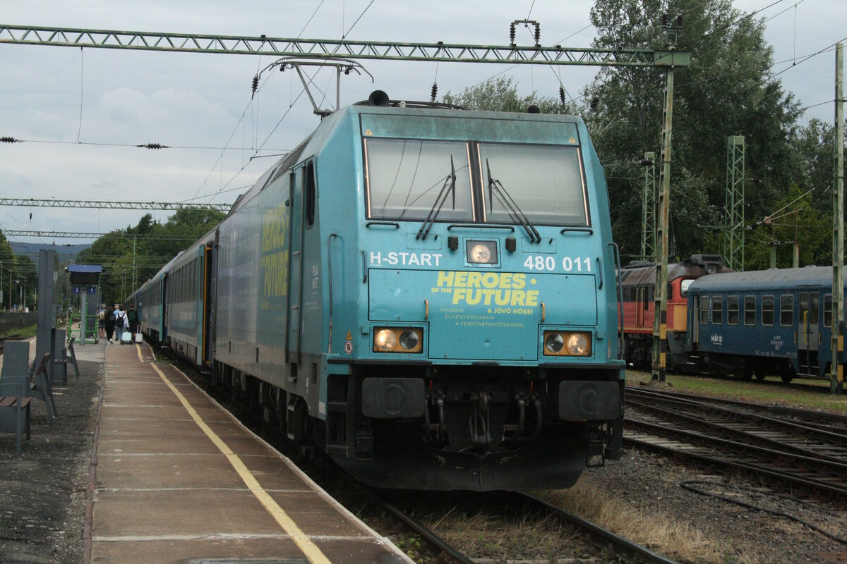 H-START 480 012  HEROES of the FUTURE  steht bereit für das Abfahrt mit den Balaton InterCity zug, nach Budapest-Déli.