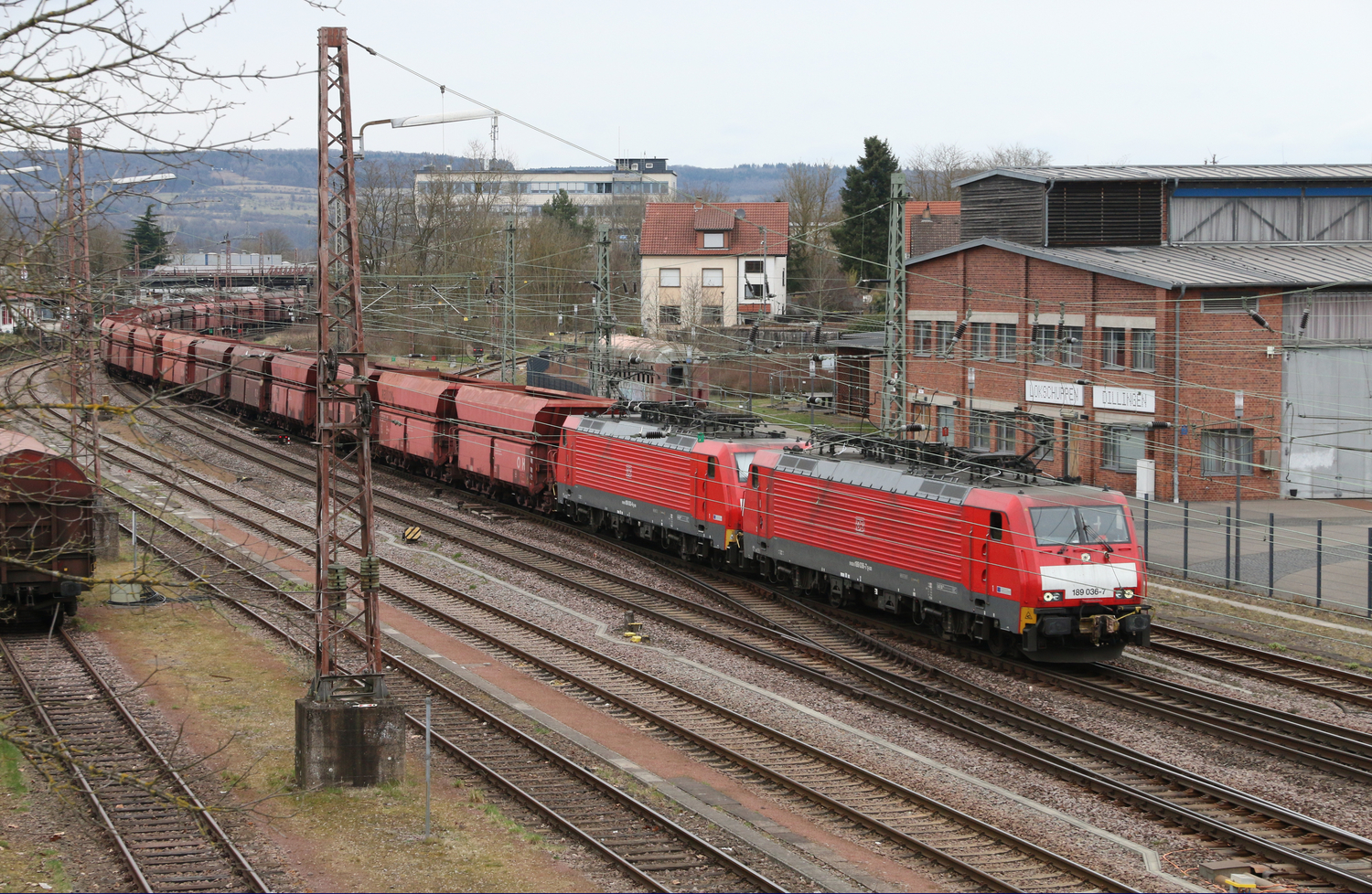 189 025-0 fährt mit einem gemischten Güterzug aus Richtung Grevenbroich durch Rommerskirchen in Richtung Köln.