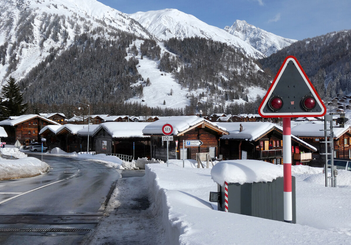 Bahnübergang Furkastrasse in Oberwald: der Schlagbaum ist abmontiert, das Gleis (unten links) liegt unter einer dicken Schneedecke. Oberwald, 13.02.2026 Markus Gmür