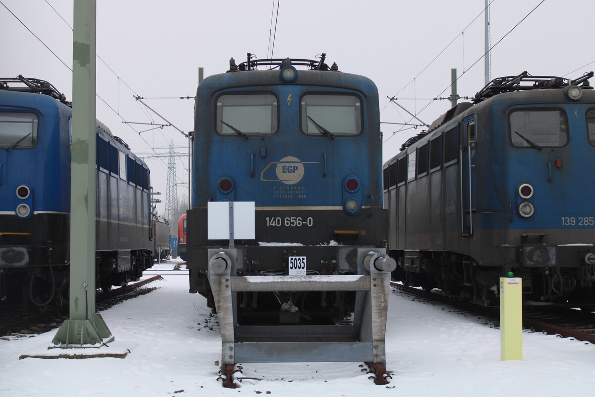 EGP 140 656-0 am 17.02.2026 in der Railpool Lokservicestelle in Hamburg-Altenwerder. Durch den Zaun fotografiert.