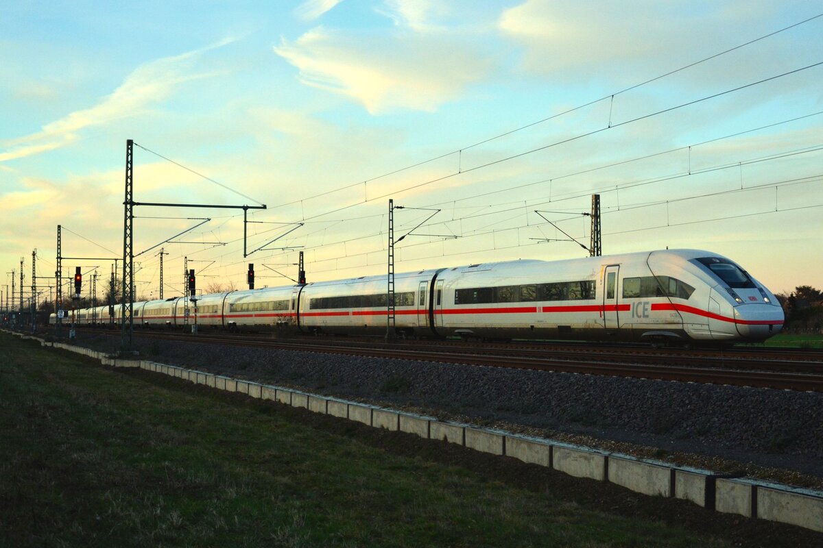 ICE-taugliche Fotostelle: Ein verspäteter 412 passiert die Stadt Landsberg (Saalekreis).