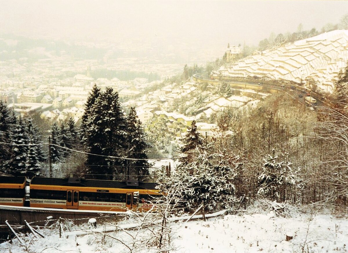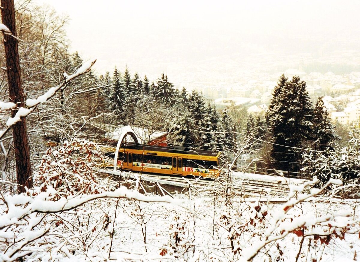 SSB Stuttgart__Gleis- und Tunnelbau____Auch die kurze  Fenstertrasse  bietet noch (kurze) reizvolle Ausblicke auf Stuttgart. Besonders reizvoll im Winter. Aber das ganze Jahr ähnelt dieser Streckenabschnitt eher einer Schweizer Gebirgsbahn als einer großstädtischen Stadtbahn.__01-01-1997