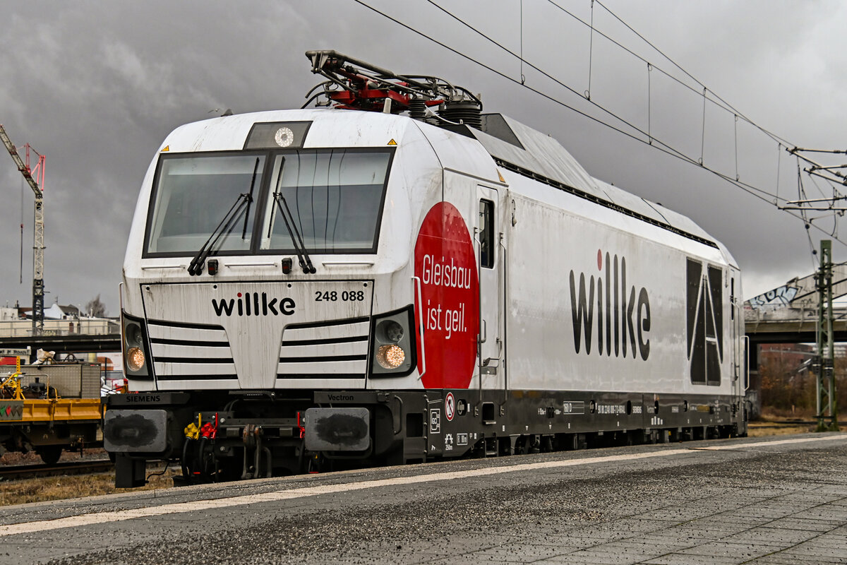 Die Zweikraftlokomotive 248 040 (Leonard Weiss LW) beförderte am 27.01.2026 einen langen Gleisbauzug (ebenfalls LW) südwärts durch Würzburg. Matthias Kümmel