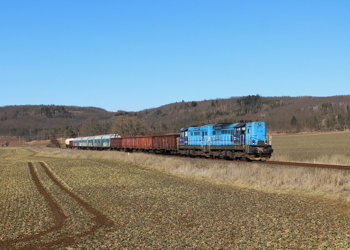 Auf der interessanten Strecke zwischen Becov nad Teplou und Rakovnik fahren auch 2 Mal die Woche Übergaben mit Holz aus den umliegenden Wäldern. AM 11.03.2025 wurden im Sandwich von 2 Transistoren 3 leere Eas nach Stedra gebracht. Dabei die 742 419 als Zuglok und die 742 194 schob nach.