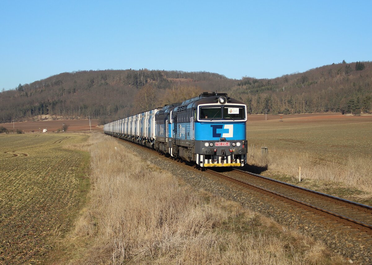 750 287-5 und 750 235-4 zu sehen am 05.03.25 mit einem vollen Kohlezug (Umleiter) von Comutov nach Plzeň in Blatno u Jesenice. Geschoben haben 742 437-7 und 742 216-5.