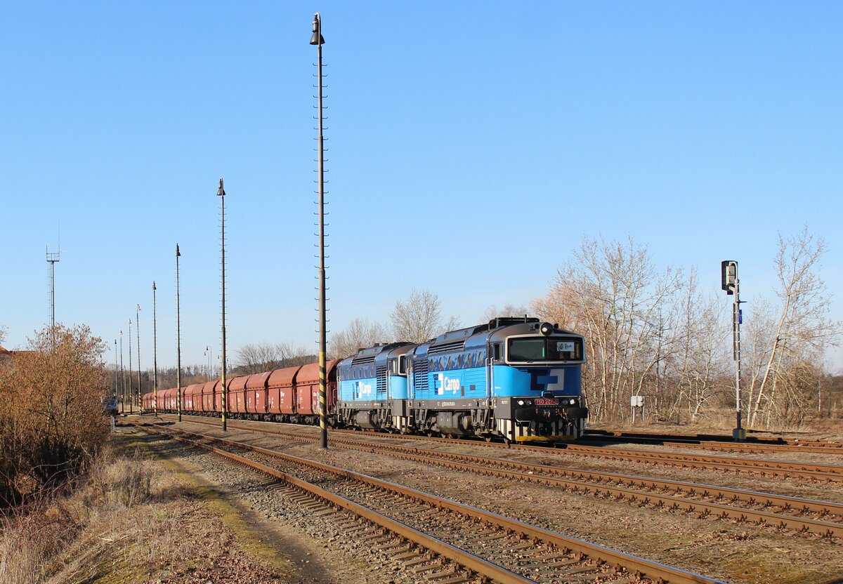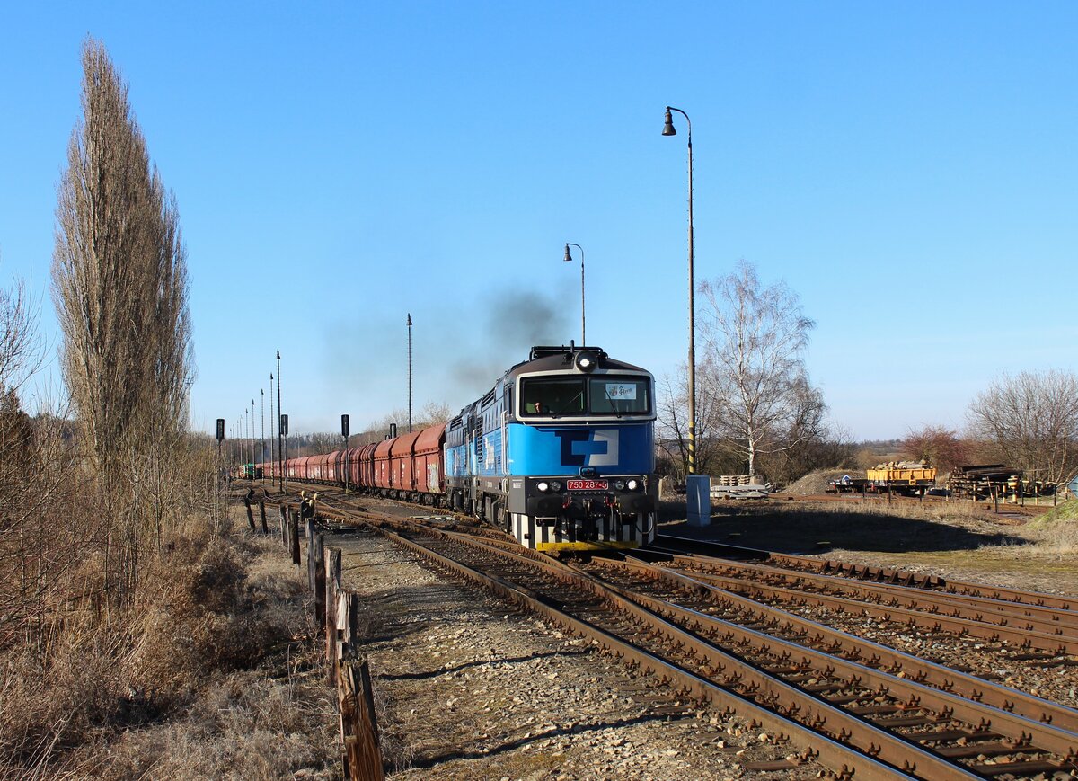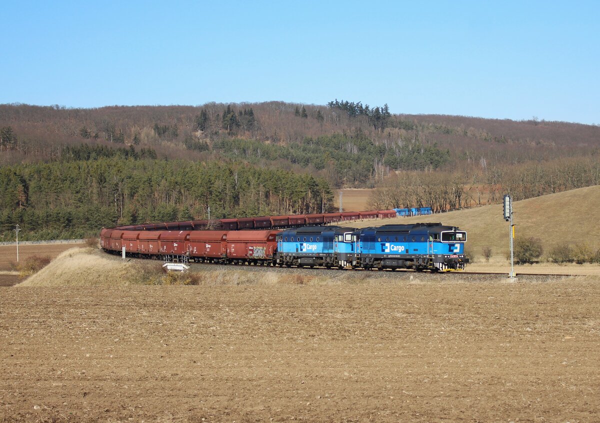 750 287-5 und 750 235-4 zu sehen am 05.03.25 mit einem vollen Kohlezug (Umleiter) von Comutov nach Plzeň in Blatno u Jesenice bei der Abfahrt. Geschoben haben 742 437-7 und 742 216-5.