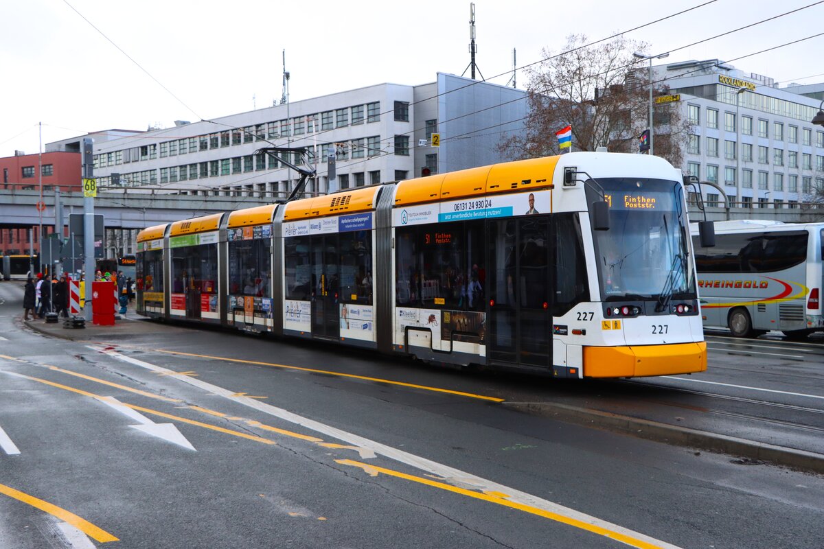 Mainzer Mobilität Stadler Variobahn Wagen 227 am 16.02.26 in Mainz Hbf