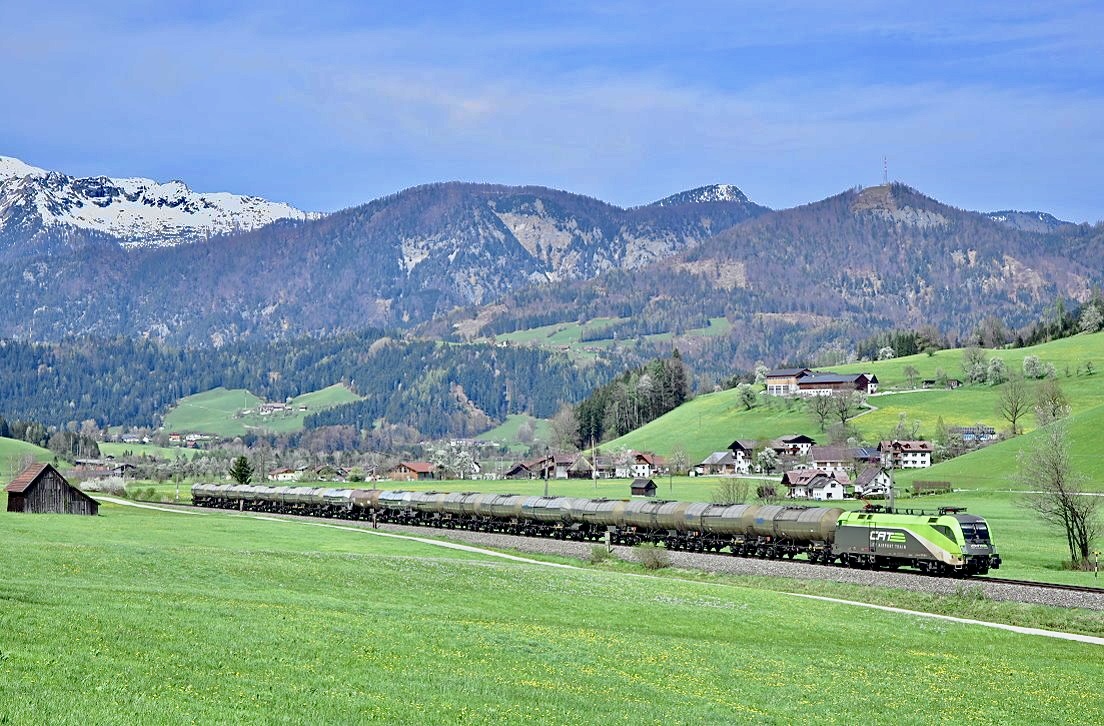Die 1016 048 "Florian" bespannte Mitte Juli 2024 einen Kesselzug von Stadlau nach Spielfeld-Straß, und wurde dabei von mir in Wildon fotografiert. Im Hintergrund zu sehen sind die aktuell höchsten Bauwerke der Steiermark nämlich die jeweils 175 Meter hohen Schornsteine des Fernheizkraftwerkes bzw. jene des Gas- und Dampfkraftwerks Mellach Kriwetz Lukas