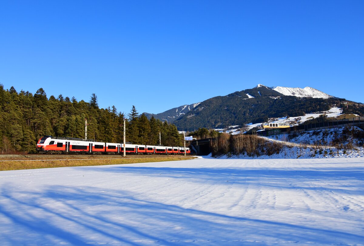 Bei Flaurling an der Arlbergbahn ergibt sich dieser weite Blick auf die 2662 Meter über dem Adriaspiegel liegende Hohe Munde. Während sich diese am 27.12.2025 leicht angezuckert präsentierte, war der 4024 026-8 als S4 5177 nach Jenbach im schneefreien Oberinntal unterwegs. Markus
