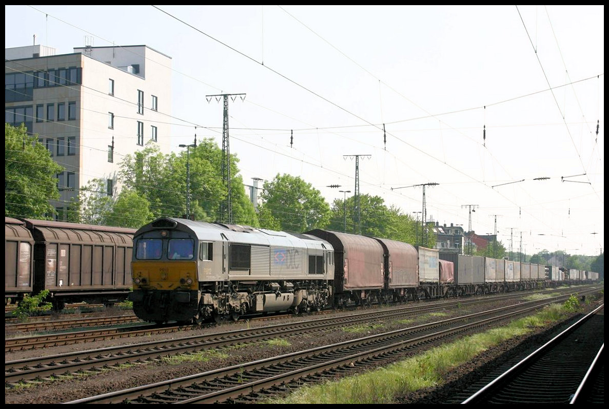 DLC Class 66 kommt hier am 11.5.2006 um 16.24 Uhr in Richtung Norden mit einem Güterzug durch Köln West.