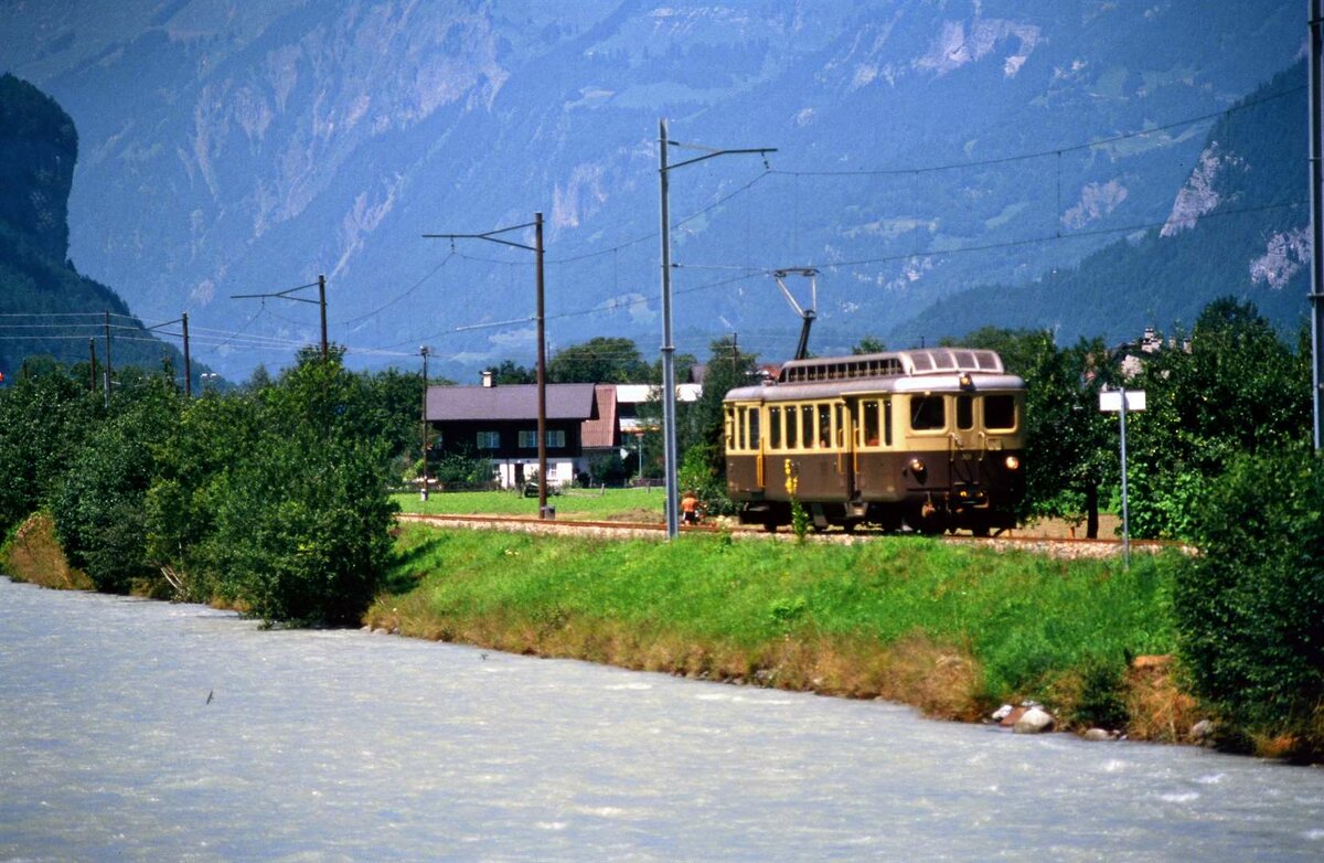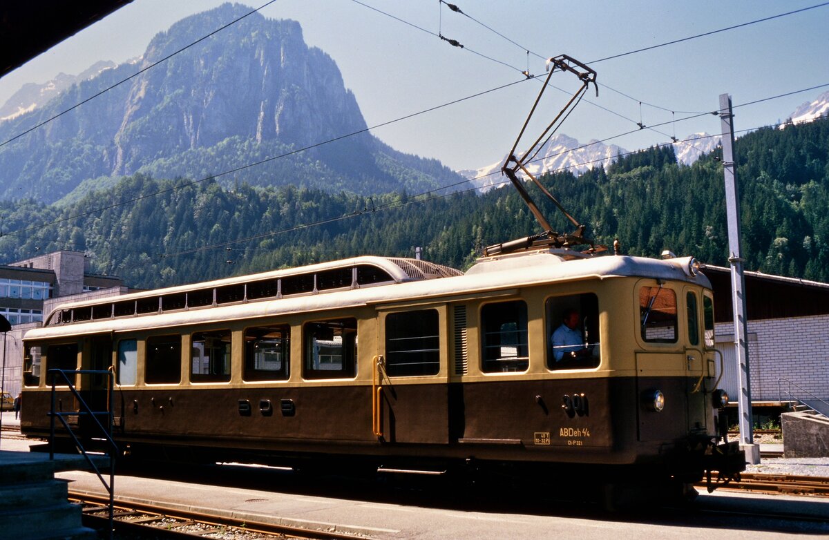 Motorwagen 301 der Schweizer Baureihe ABDeh 4/4 (Berner Oberland-Bahnen, BOB) auf der Privatbahn Meiringen-Innertkirchen-Bahn (MIB) bei der Station Unterwasser (1988) Frank Nowotny