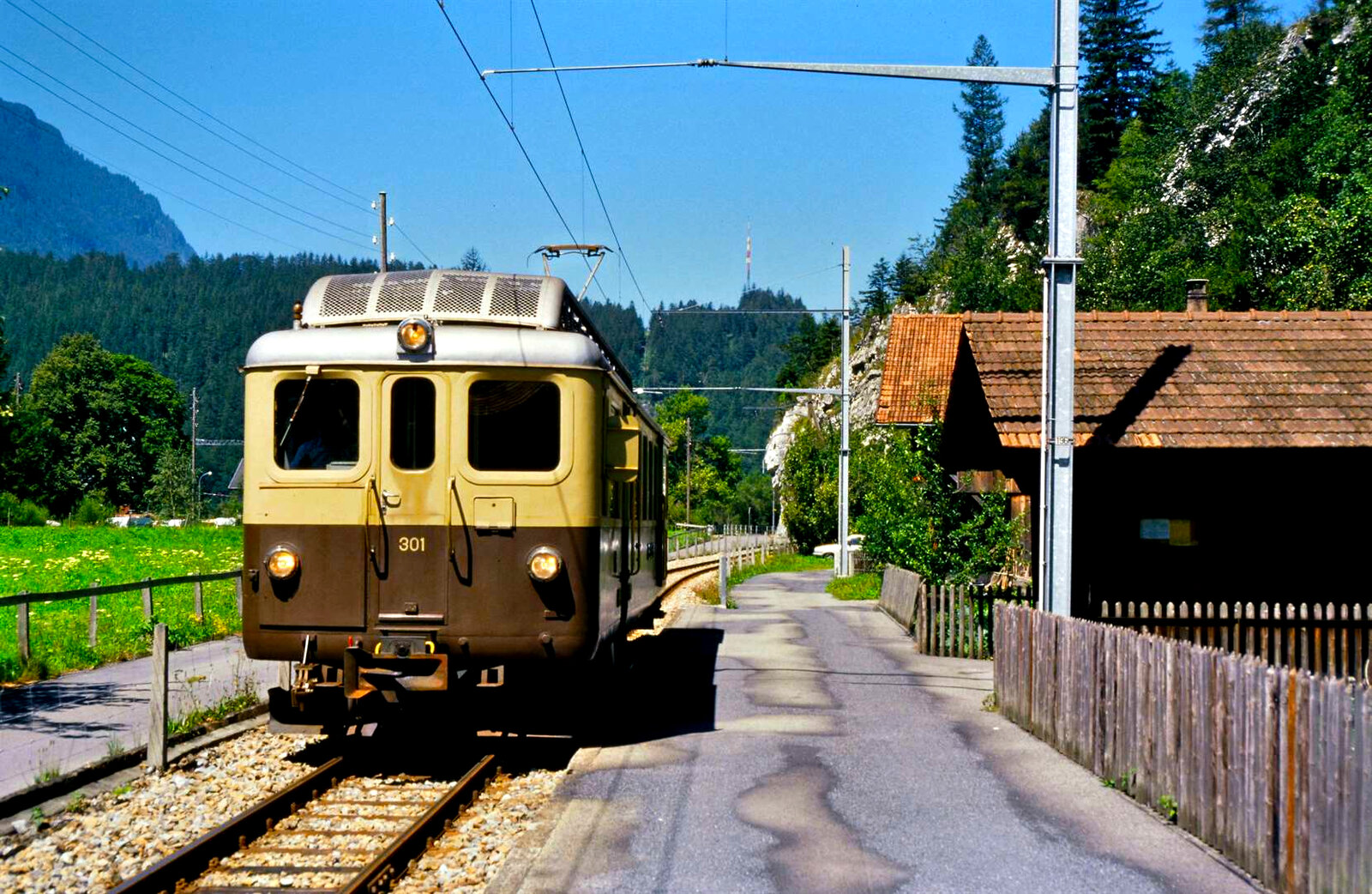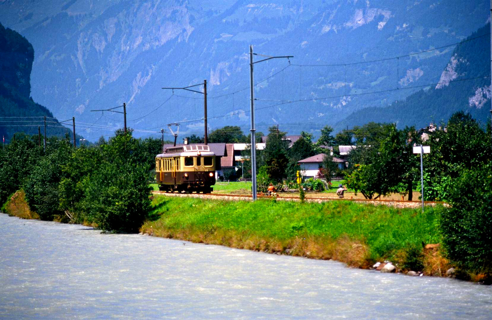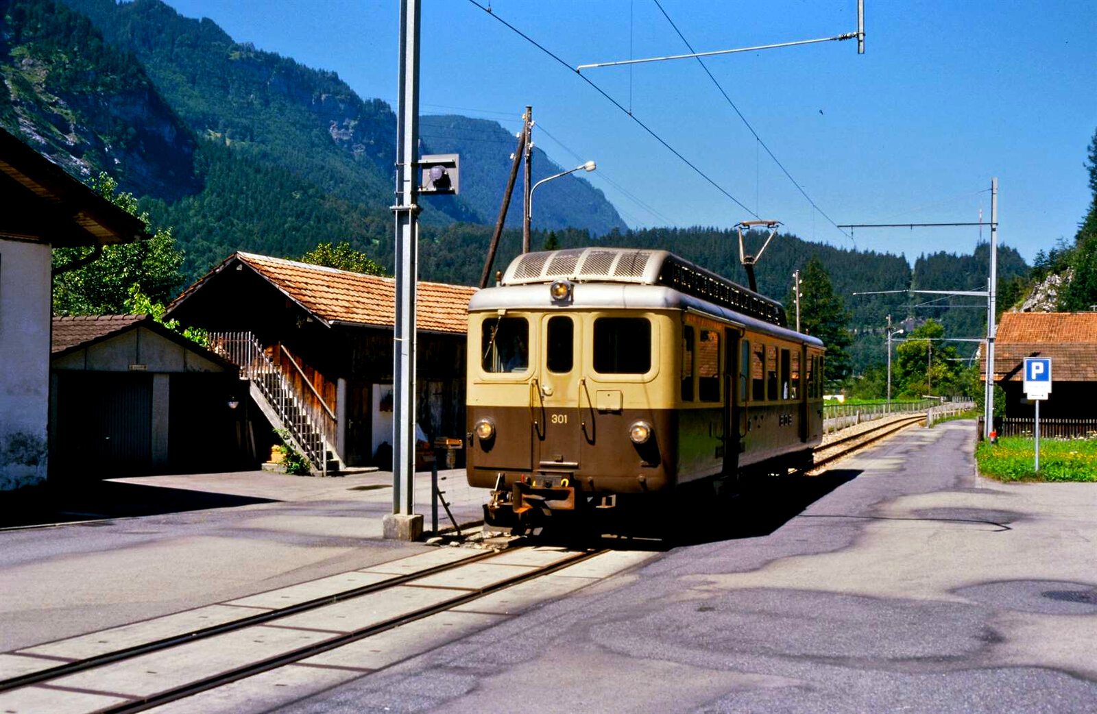 Motorwagen der Schweizer Baureihe ABDeh 4/4 (Nr.301 Berner Oberland-Bahnen). Völlig ungesichert fährt Nr. 301 durch den Ort, als ob es die Schweizer Privatbahn Meiringen-Innertkirchen-Bahn (MIB) schon immer gegeben hätte (1988) Frank Nowotny