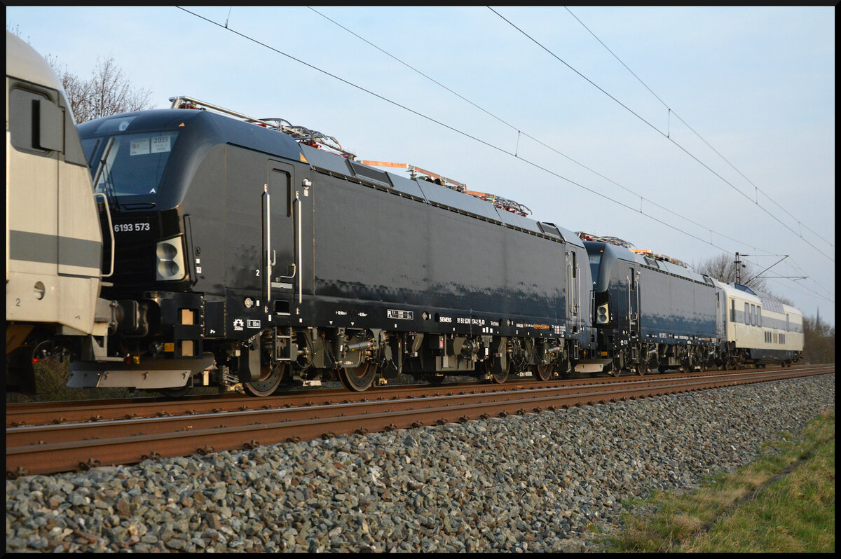 Am 01.05.25 schleppte der CargoUnit-Vectron 370 049 seinen Captrain-Bruder 193 784 sowie einen Shavemaker-Containerzug durch Jütrichau Richtung Magdeburg. Martin Schneider